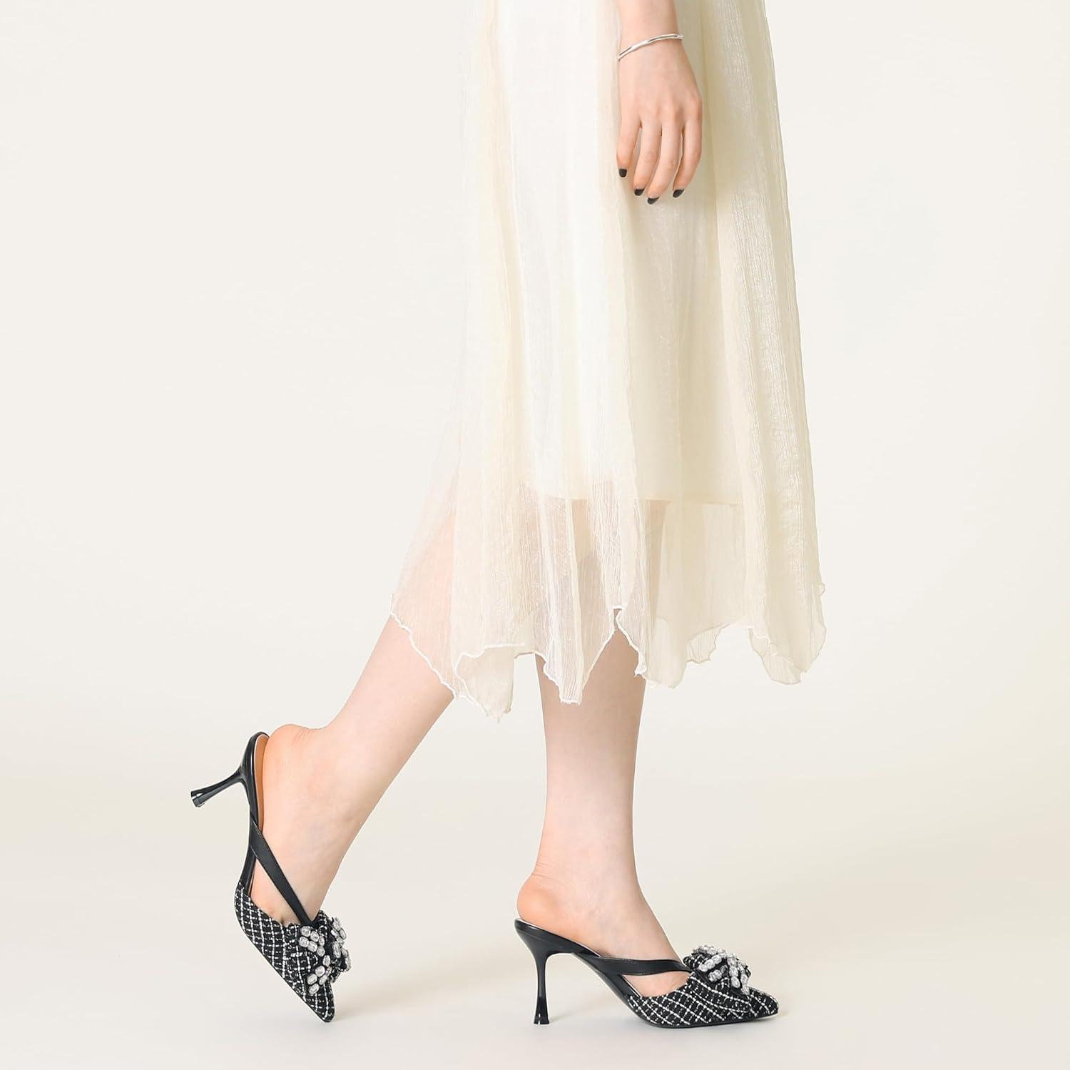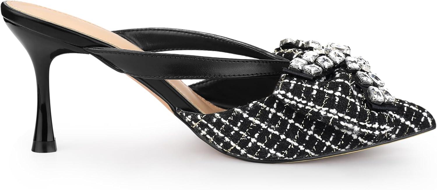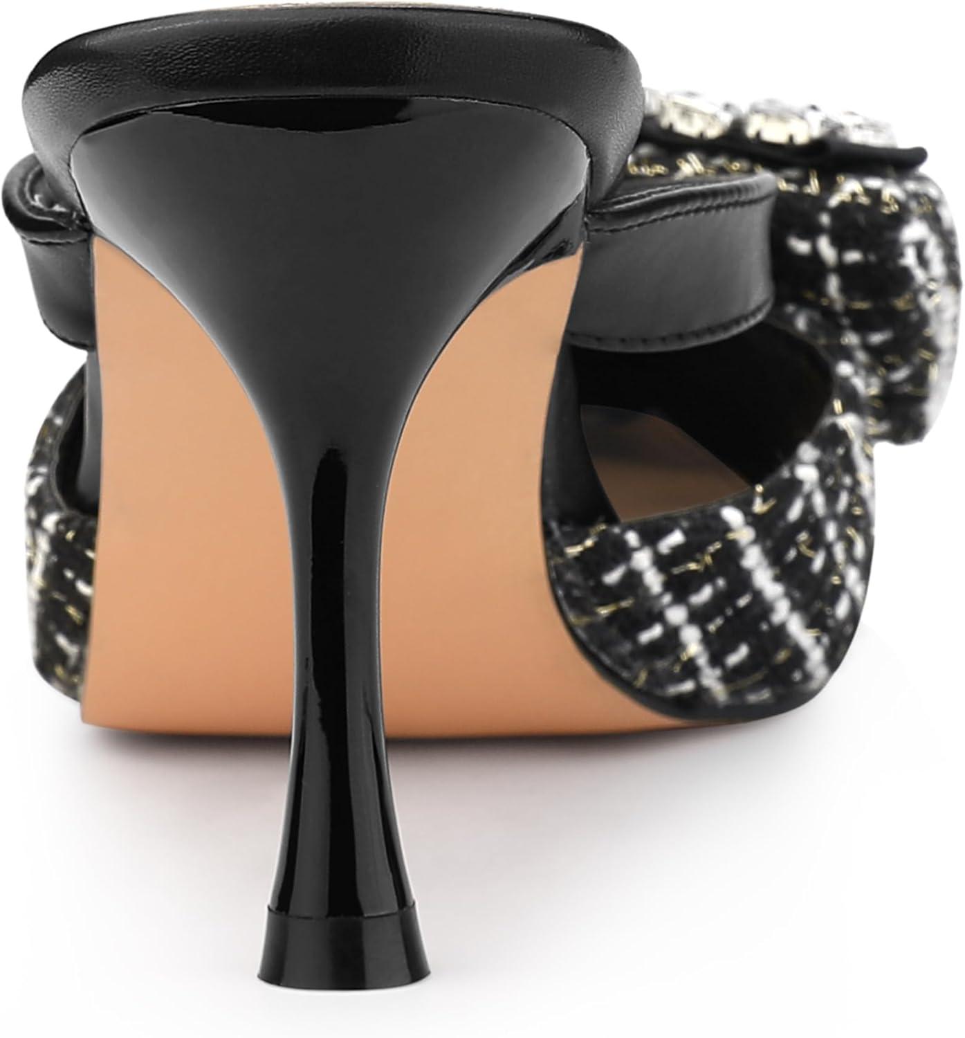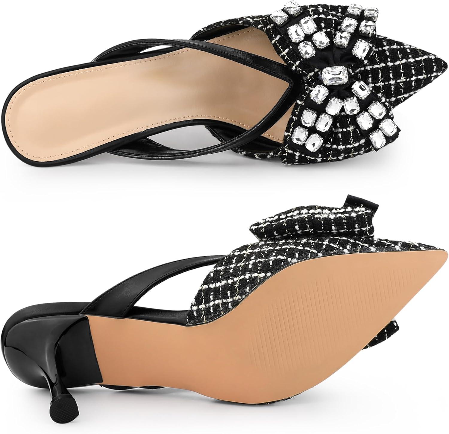 Allegra K Women’s Pointed Toe Tweed Rhinestone Bow Stiletto Heels Mules(Black)