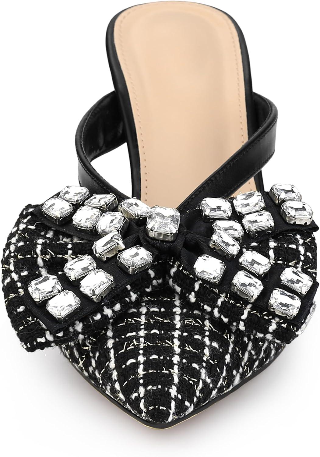 Allegra K Women's Pointed Toe Tweed Rhinestone Bow Stiletto Heels Mules(Black)