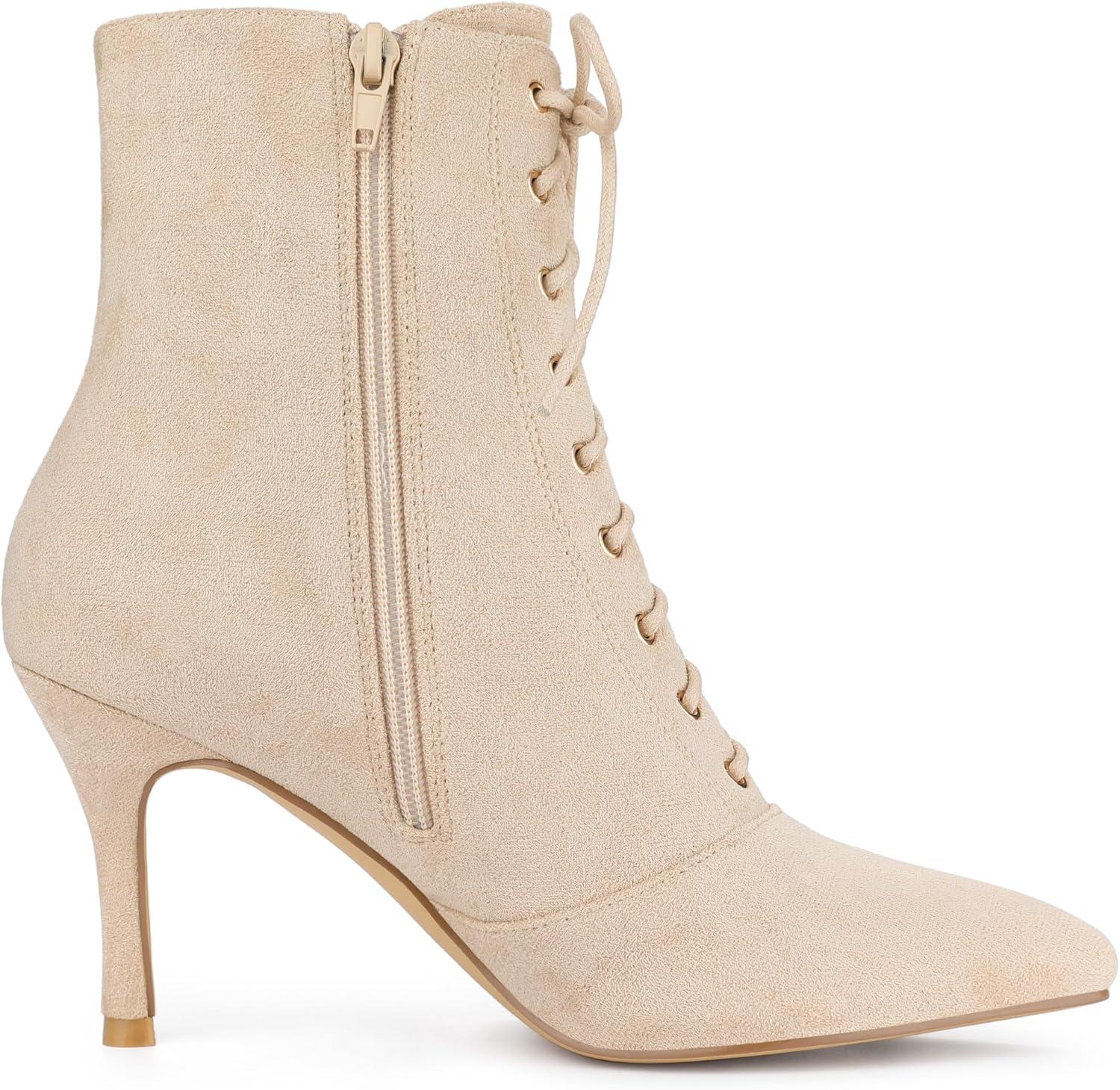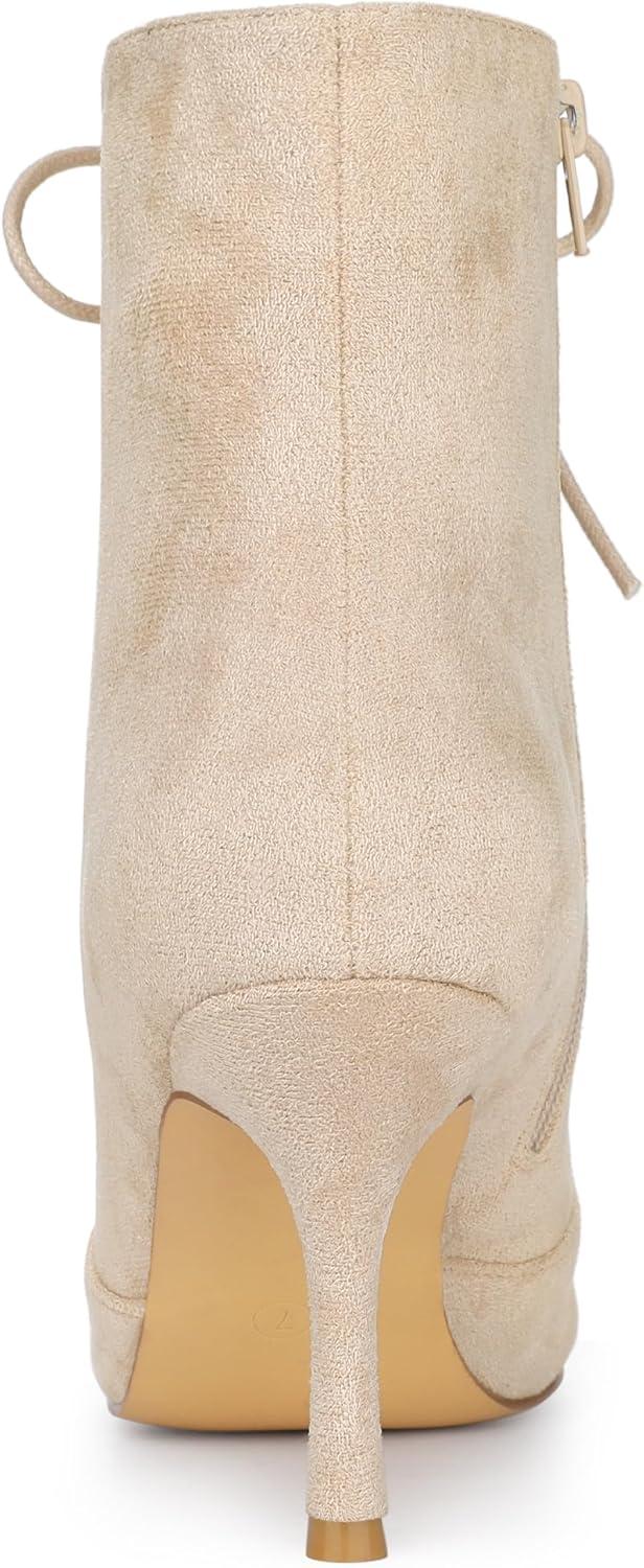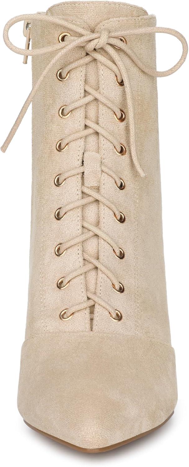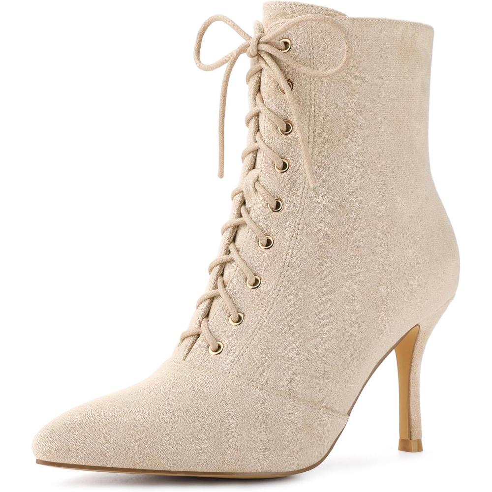 Allegra K Women’s Pointy Toe Side Zip Lace Up Stiletto Heels Ankle Boots(Beige)