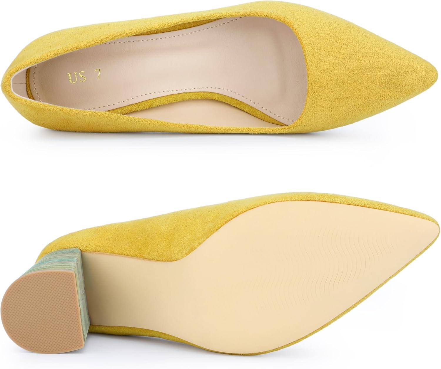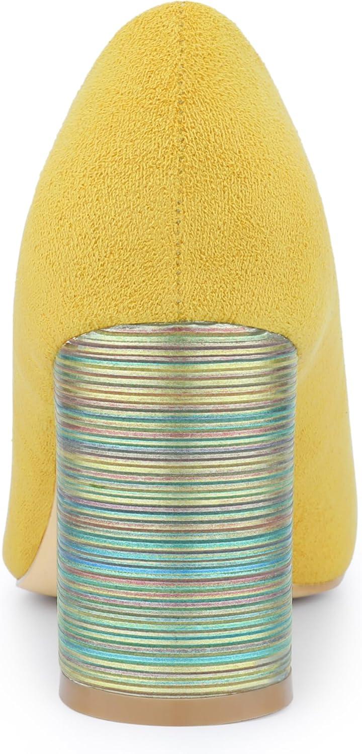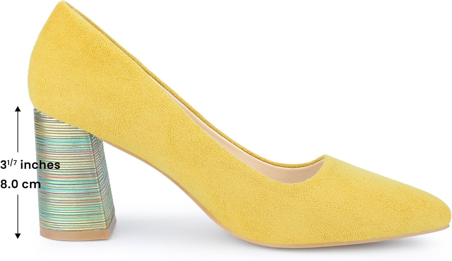 Allegra K Women’s Pointy Toe Slip on Plaid Printing Closed Toe Dress Shoes Chunky Heel Pumps(Yellow)