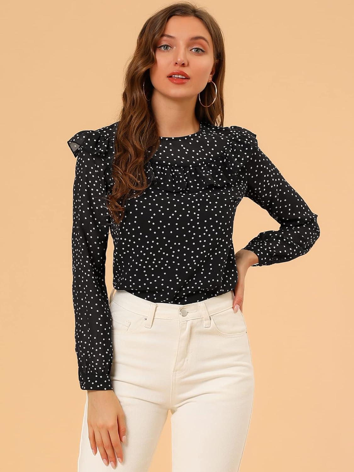 Allegra K Women’s Polka Dots Chiffon Top Elegant Crew Neck Ruffle Blouse