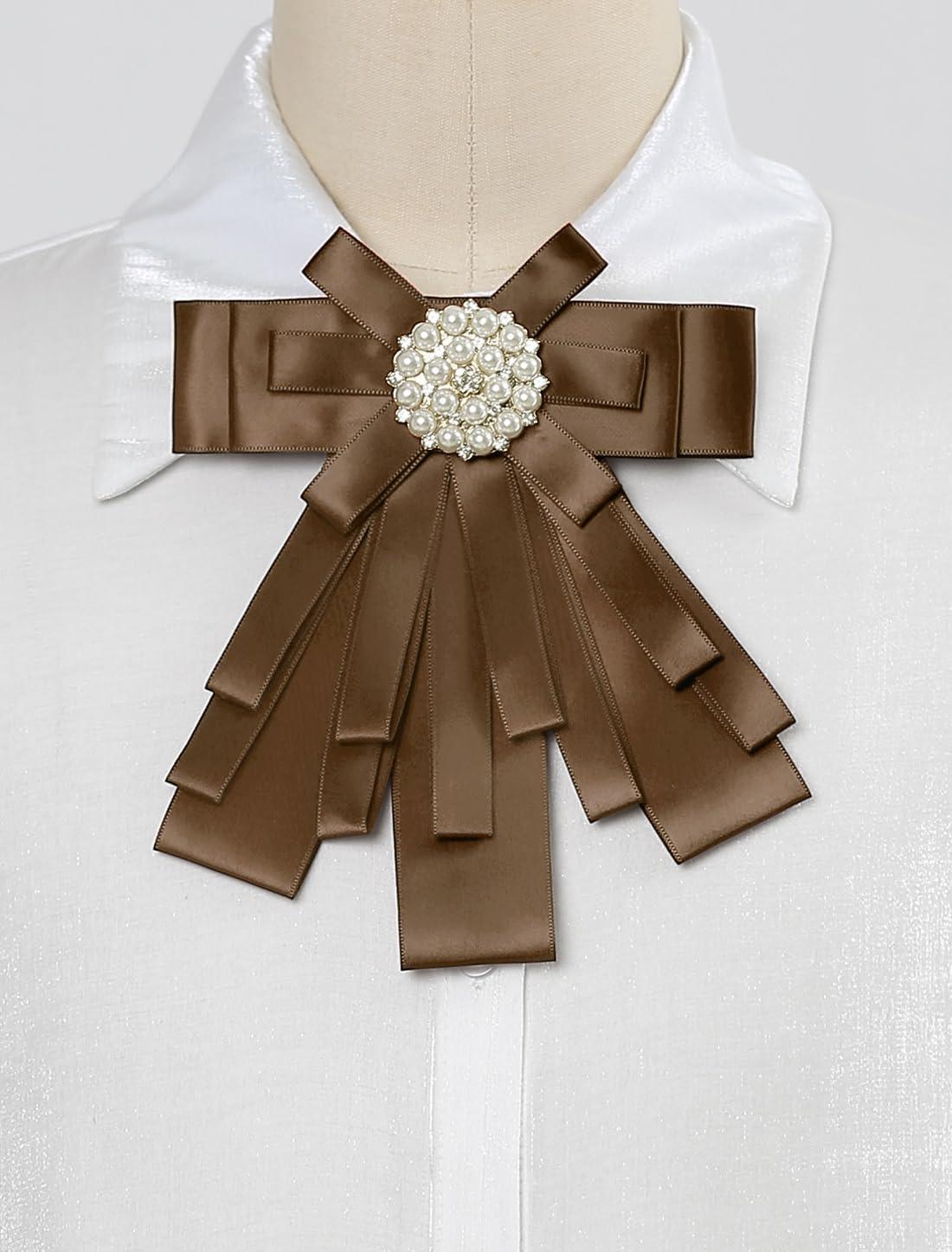 Allegra K Women’s Pre-tied Bowknot Beads Bow Tie Elegant Large Ribbon Brooch(Brown)