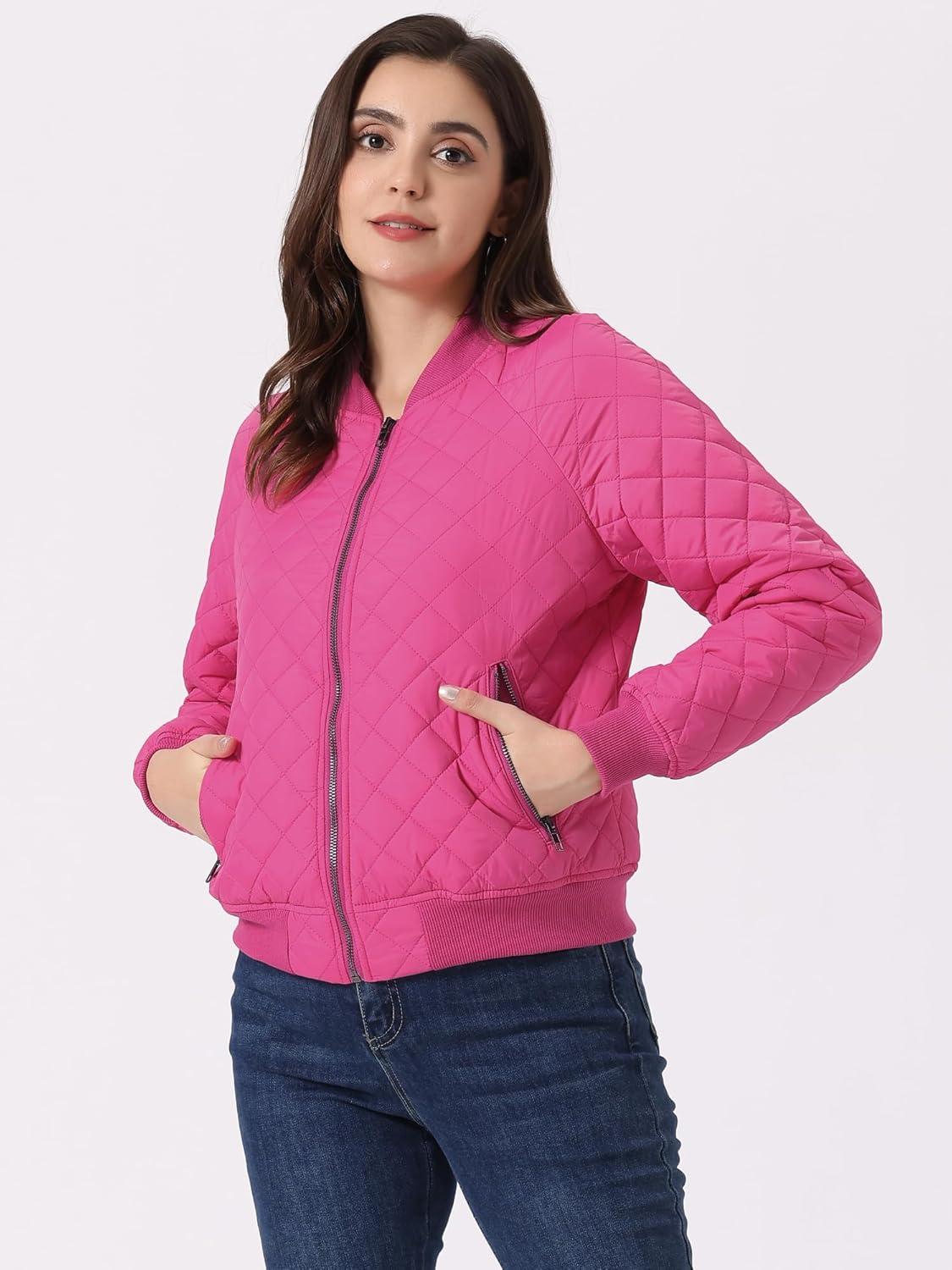Allegra K Women’s Quilted Zip Up Raglan Long Sleeve Bomber Jacket(Hot Pink)