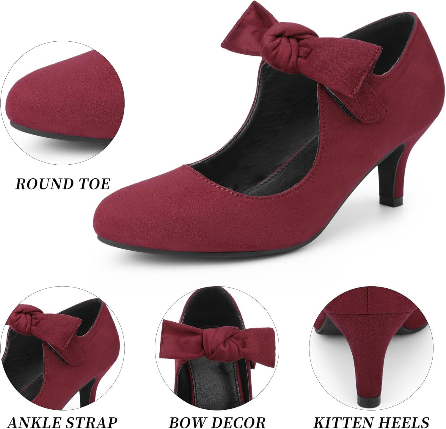 Allegra K Women’s Round Toe Knot Hook and Loop Strap Kitten Heel Pumps(Burgundy)