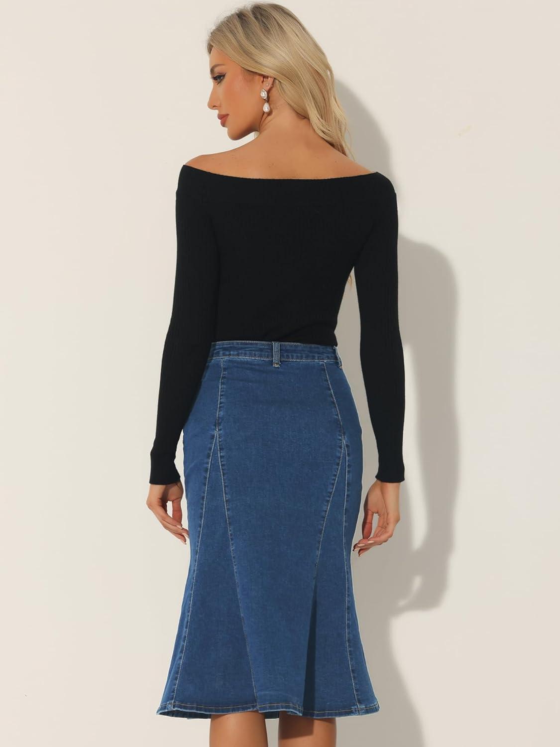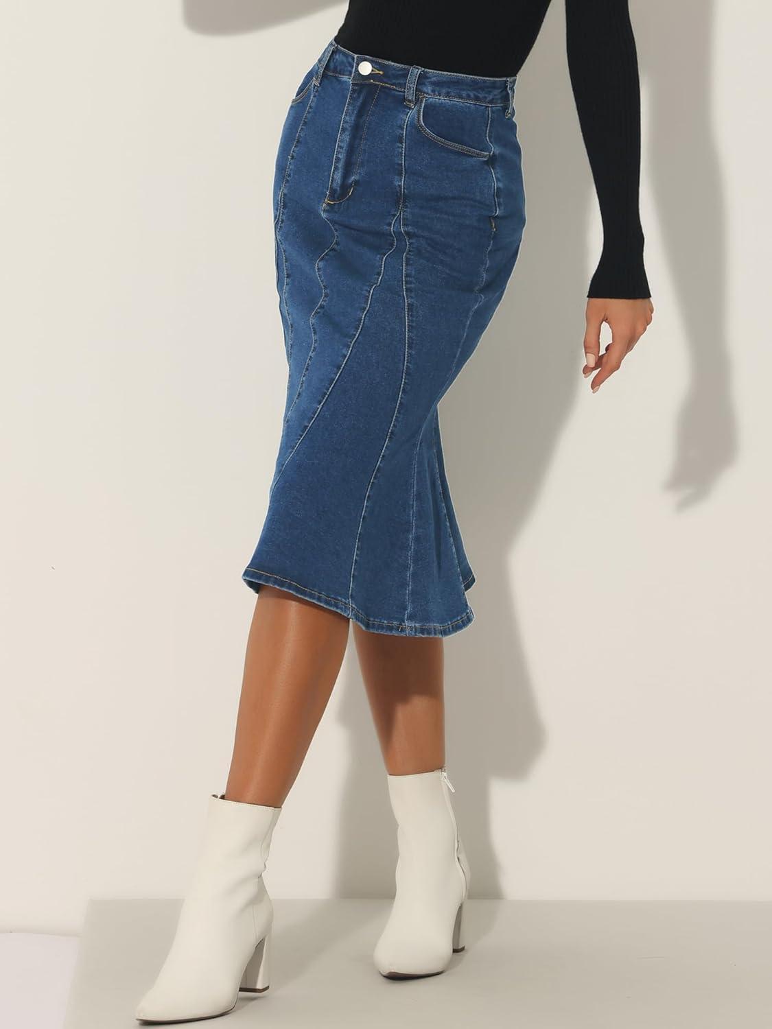 Allegra K Women’s Ruffle Denim Skirt Midi Bodycon High Waist Fishtail Jean Skirts(Deep Blue)