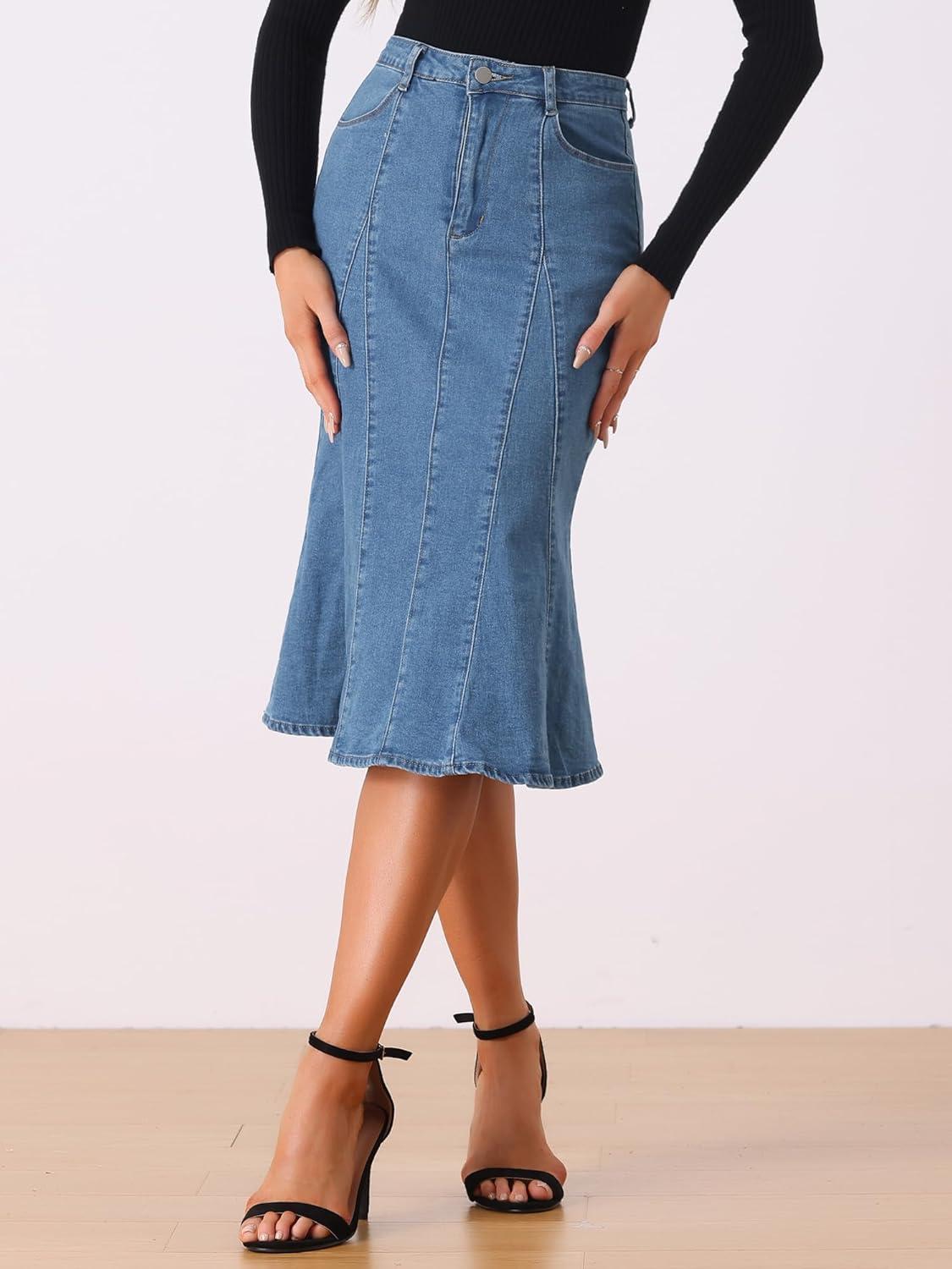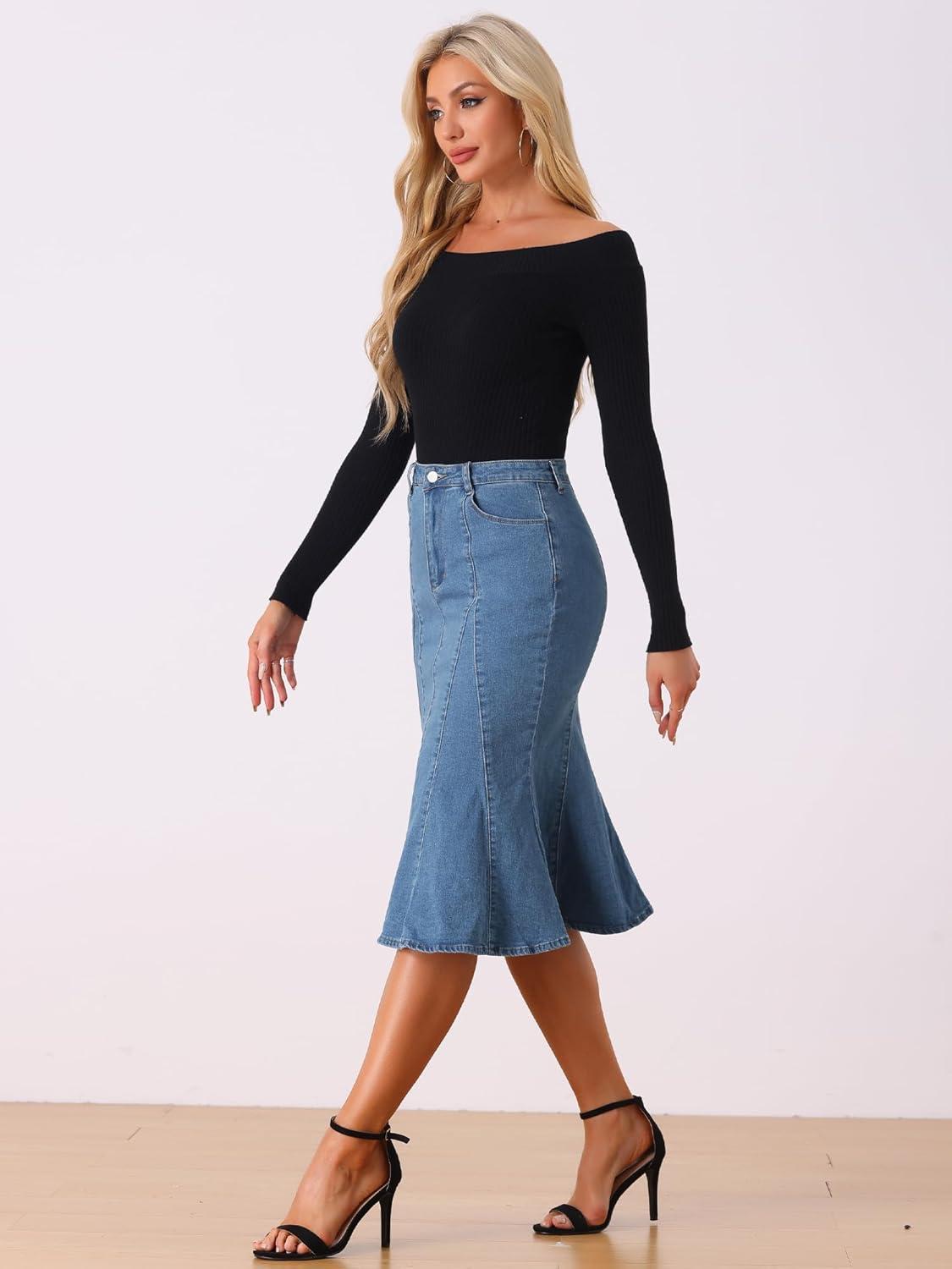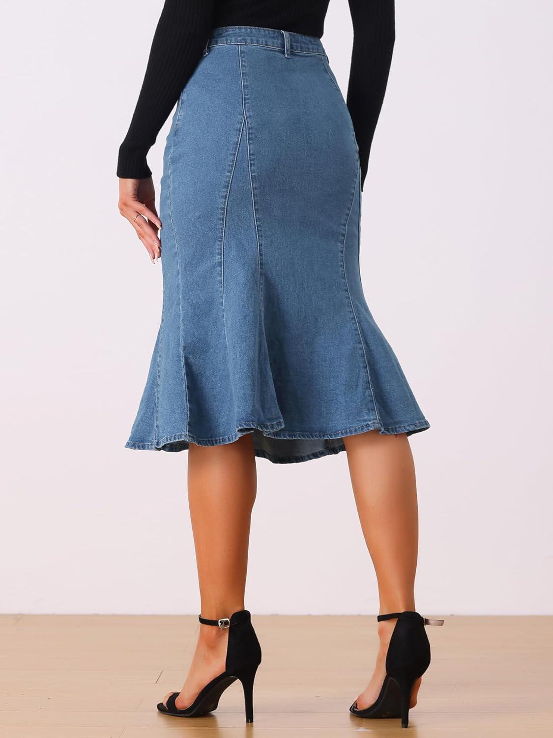 Allegra K Women’s Ruffle Denim Skirt Midi Bodycon High Waist Fishtail Jean Skirts(Sky Blue)