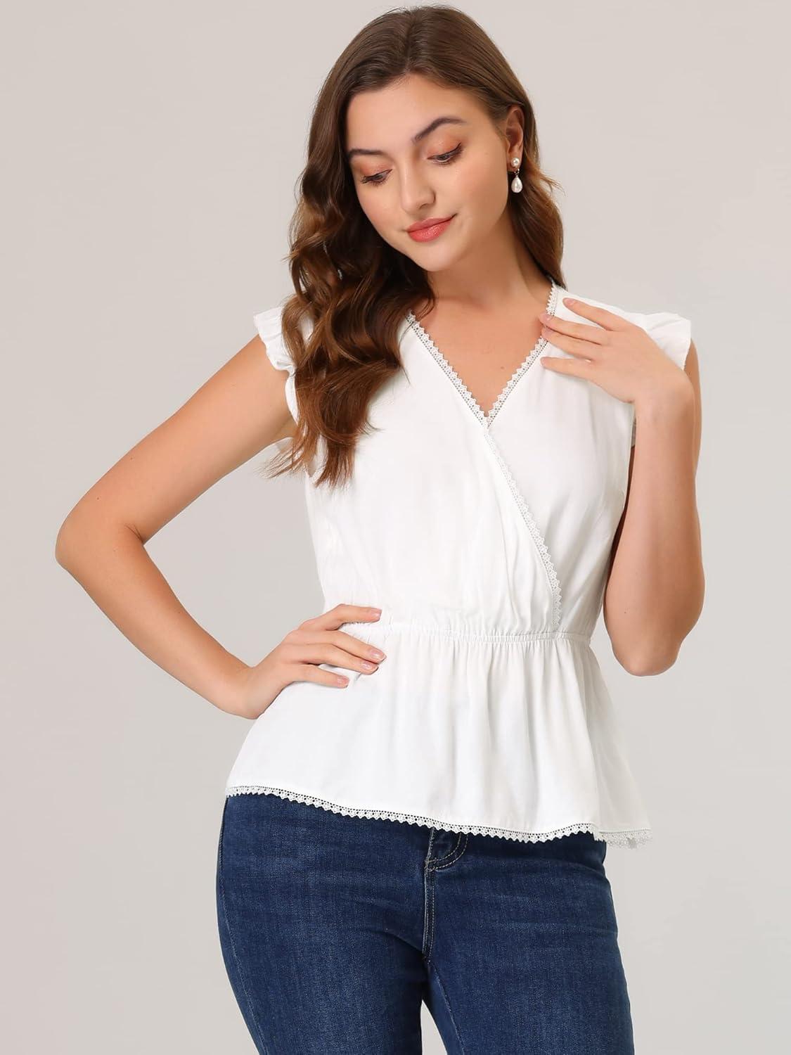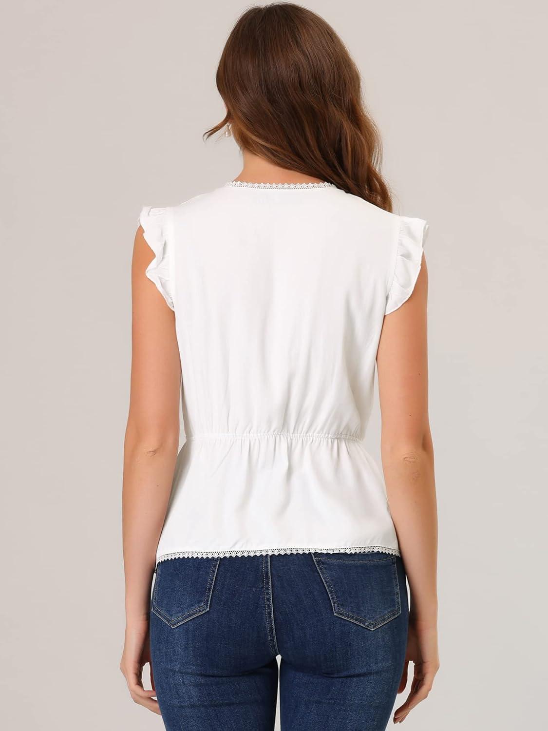 imageAllegra K Womens Ruffle Flutter Sleeve Lace Trim V Neck Peplum Blouse TopWhite