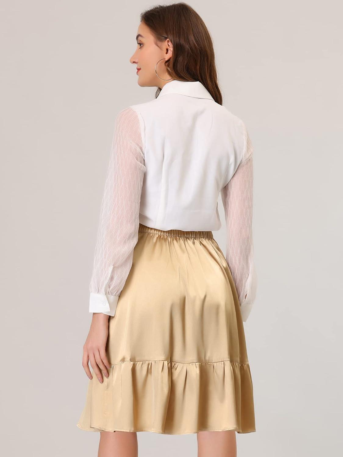 imageAllegra K Womens Ruffle Satin High Waist Tie Wrap Asymmetrical Midi SkirtBrown