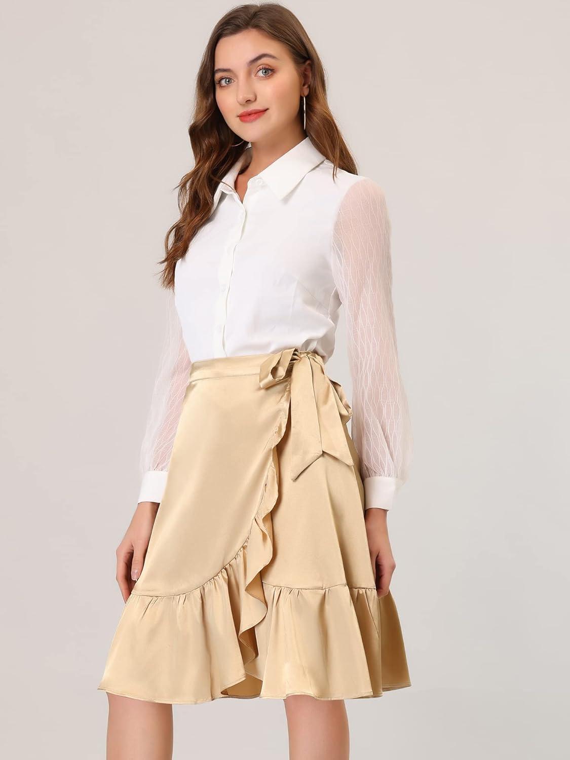 imageAllegra K Womens Ruffle Satin High Waist Tie Wrap Asymmetrical Midi SkirtKhaki