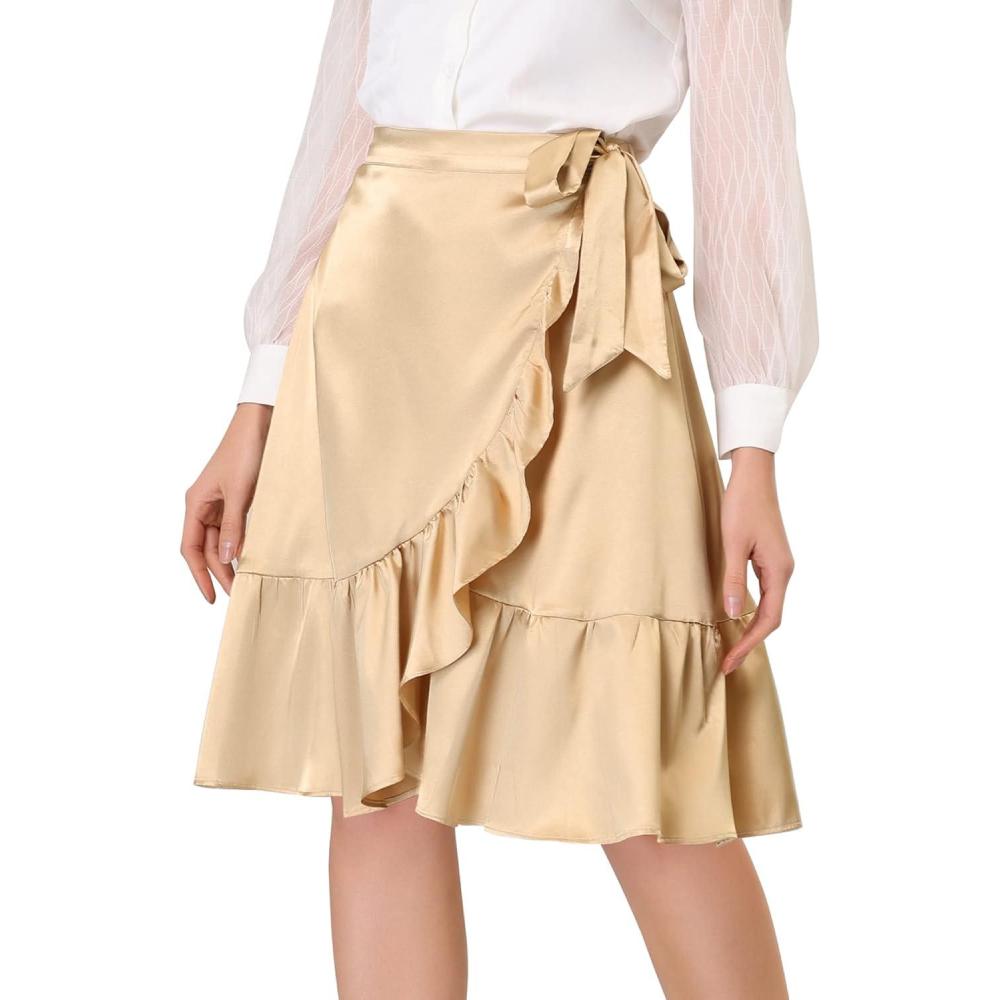 Allegra K Women’s Ruffle Satin High Waist Tie Wrap Asymmetrical Midi Skirt(Khaki)