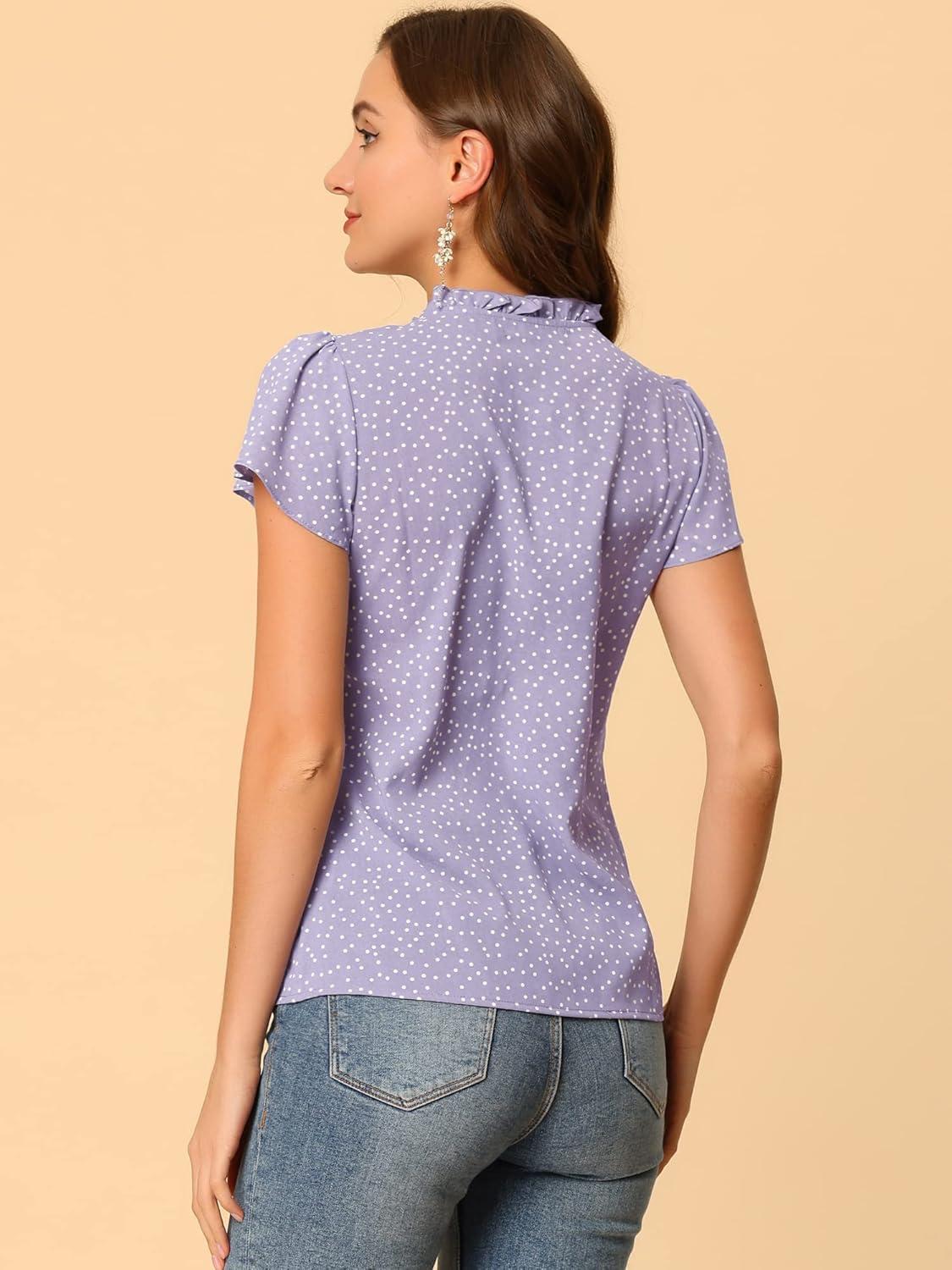 Allegra K Women's Ruffle Summer Dots Print 1950s Retro Short Sleeve Button Down Blouse Top(Purple)