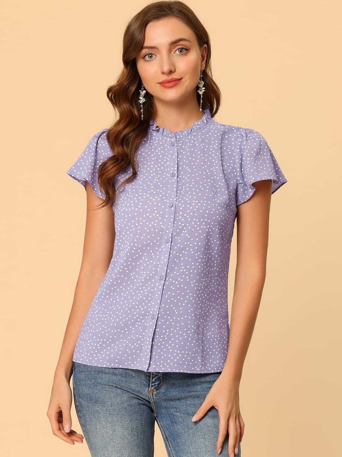 Allegra K Women’s Ruffle Summer Dots Print 1950s Retro Short Sleeve Button Down Blouse Top(Purple)