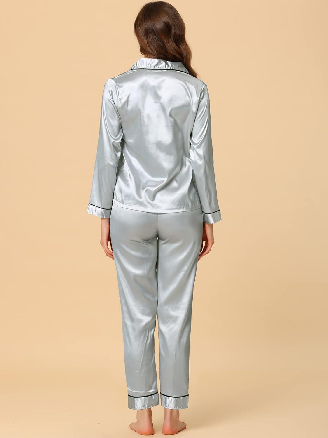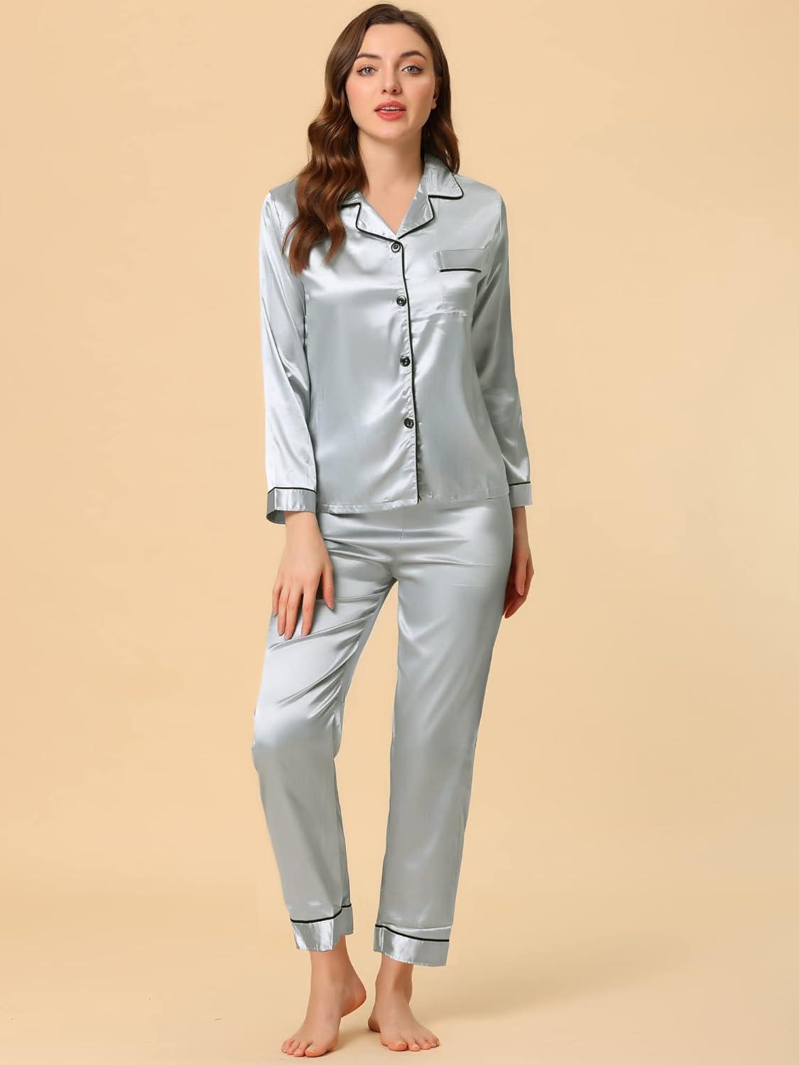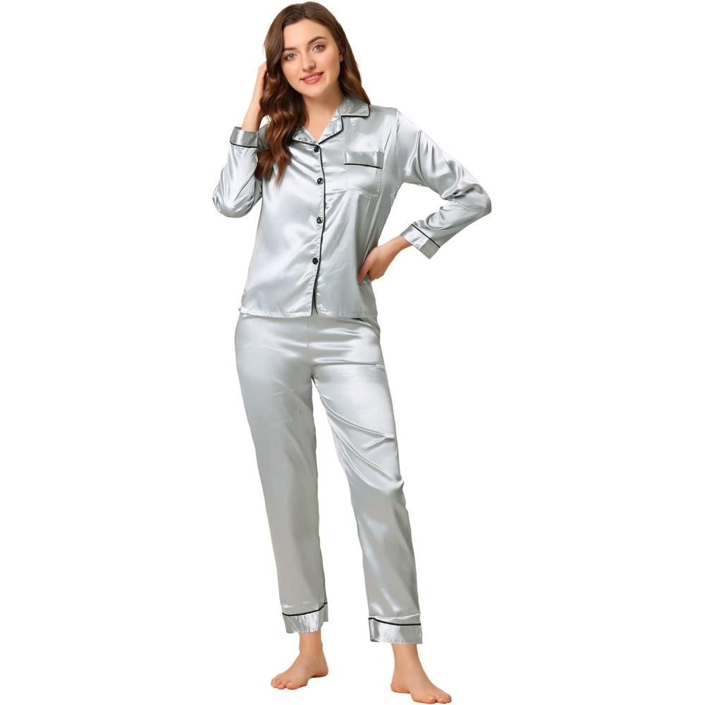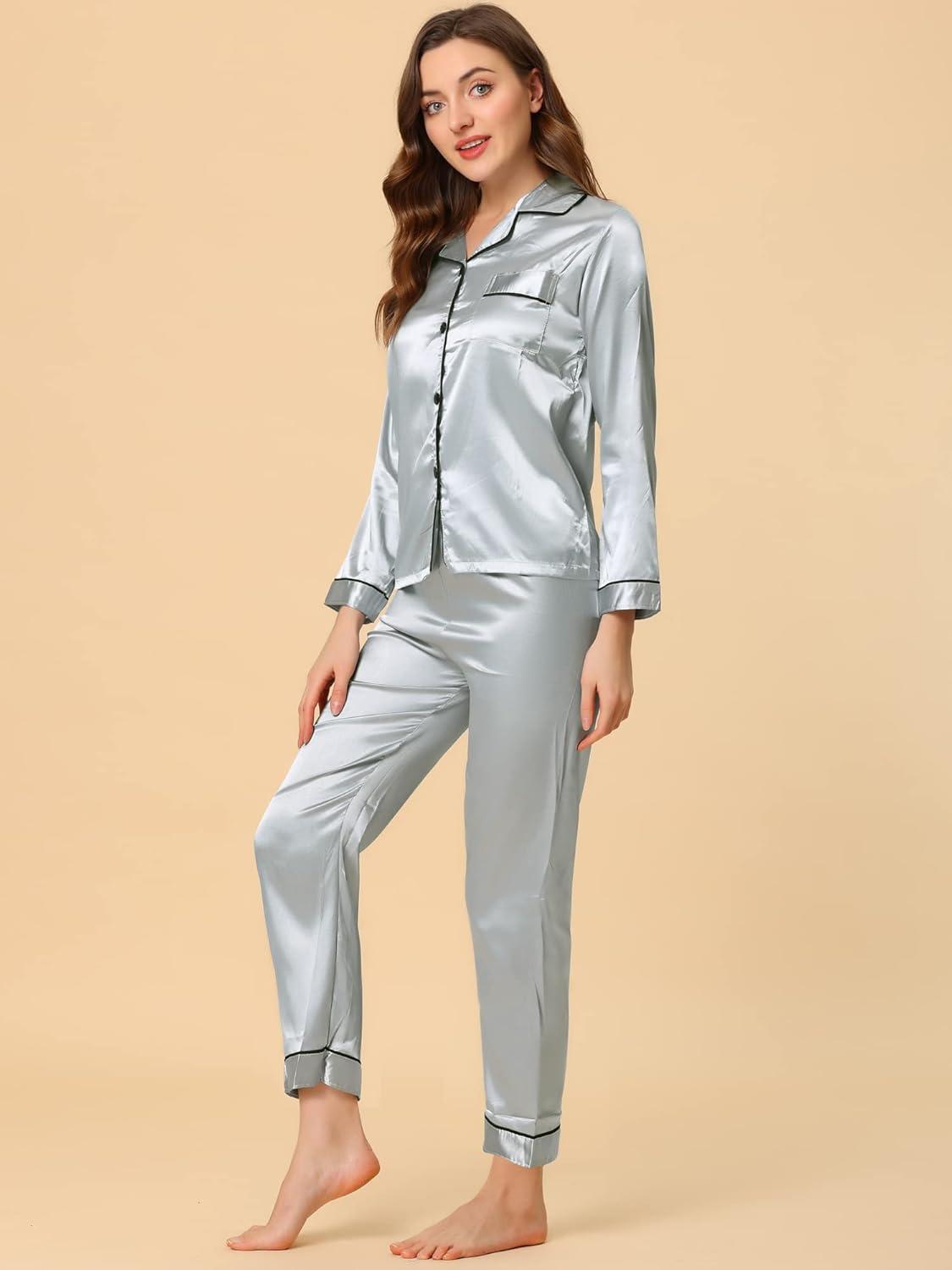 Allegra K Women’s Satin Night Suits Valentine’s Day Button Down with Pants Silky Lounge Pajama Sets(Grey)