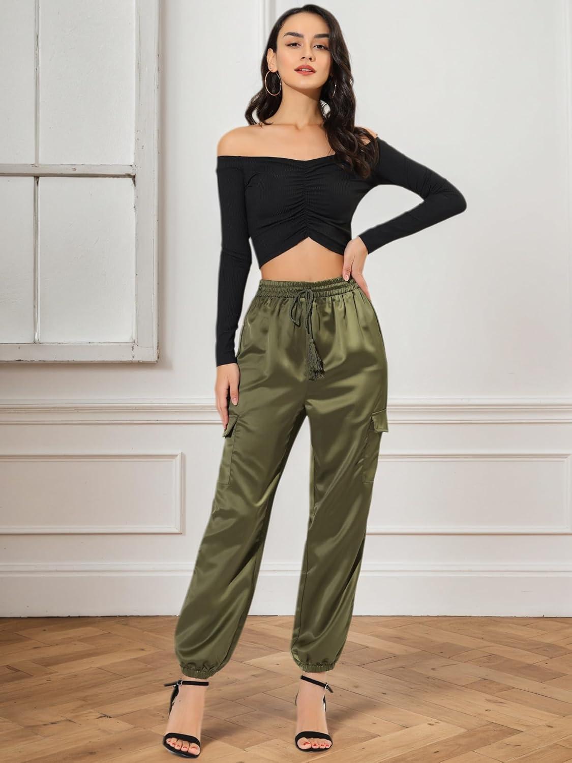Allegra K Women’s Satin Pants Tie Elastic High Waist Shiny Silky Dressy Satin Cargo Joggers(Green)