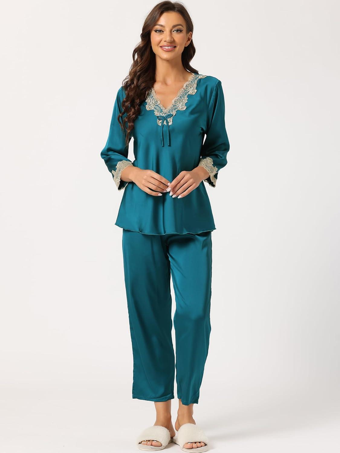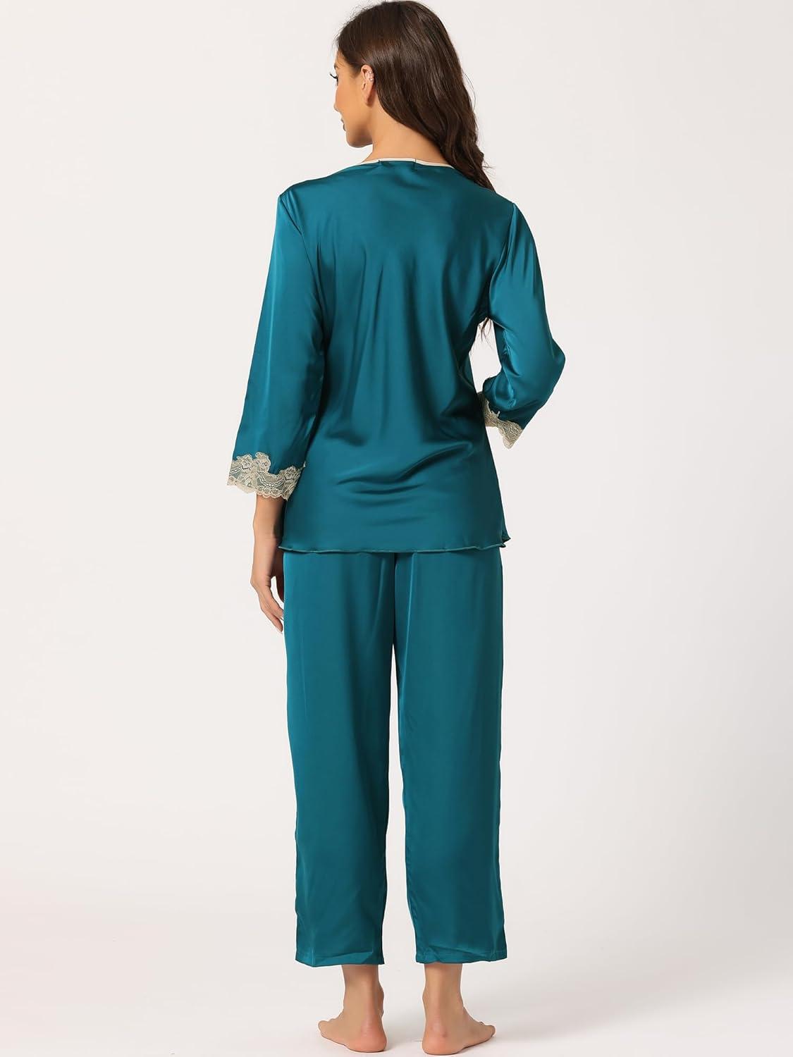 Allegra K Women’s Satin Sleepwear Night Suit V Neck Lace Nightwear Lounge Pajama Set(Dark Green)