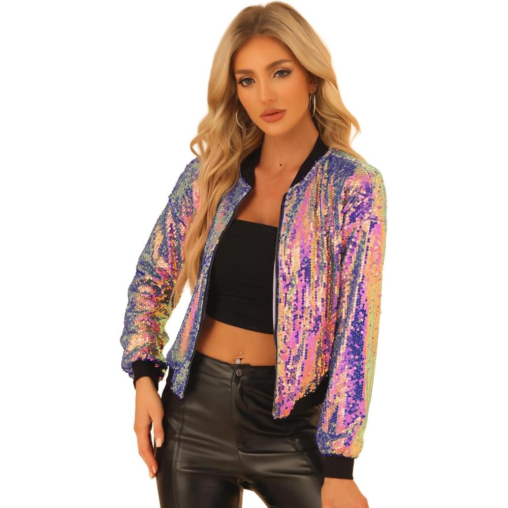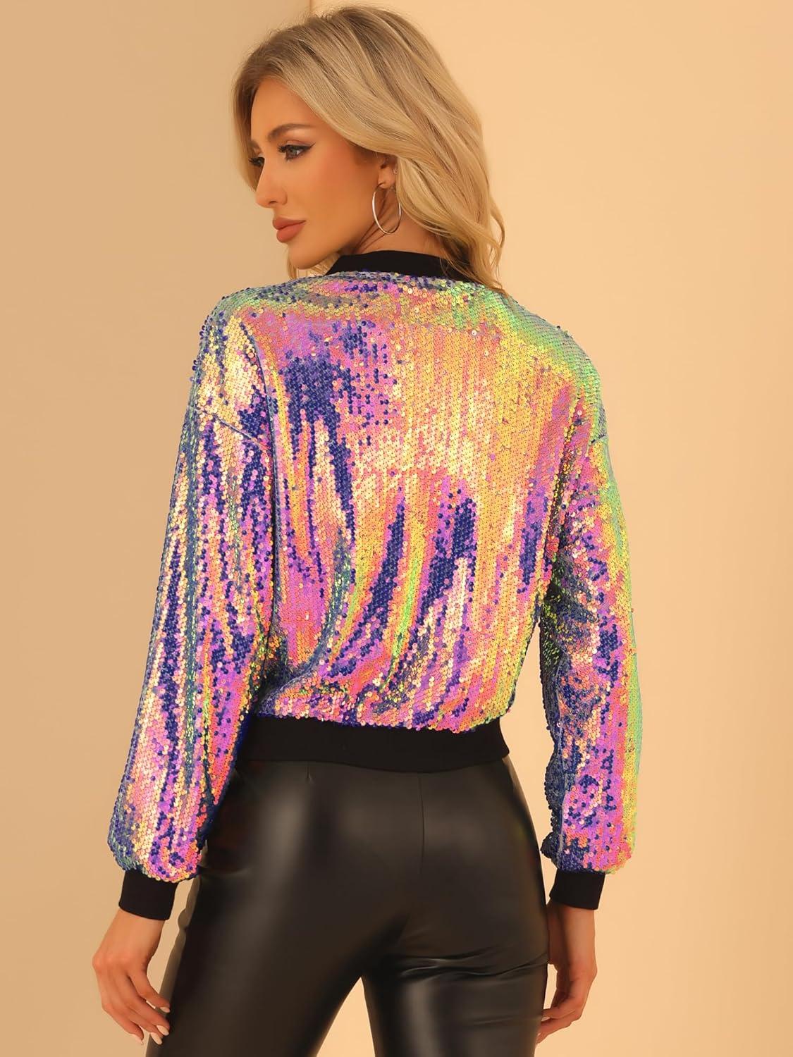 Allegra K Women's Sequin Jacket Bomber Long Sleeve Zipper Shiny Glitter Tops Sparkly Party Slitter Outfit(Multicolor)