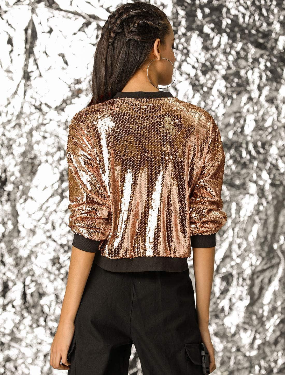 Allegra K Women’s Sequin Jacket Bomber Long Sleeve Zipper Shiny Glitter Tops Sparkly Party Slitter Outfit(Rose Gold)
