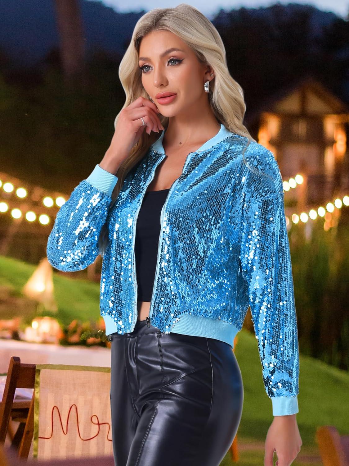 Allegra K Women’s Sequin Jacket Bomber Long Sleeve Zipper Shiny Glitter Tops Sparkly Party Slitter Outfit(Sky Blue)