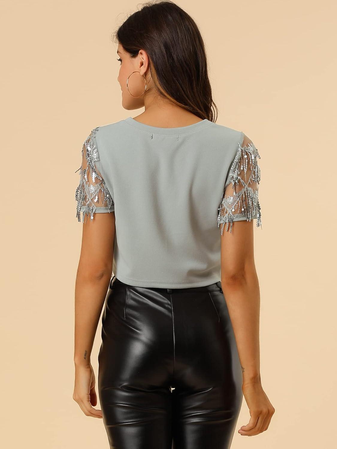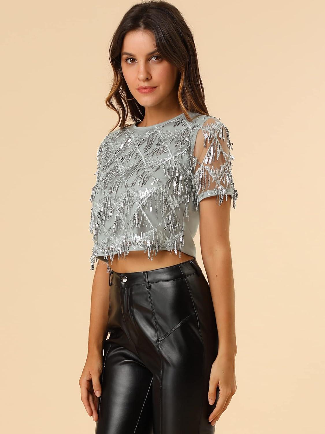 Allegra K Women’s Sequin Shiny Glitter Crop Top Christmas Short Sleeves Sexy Party Tassel T-Shirt(Silver)