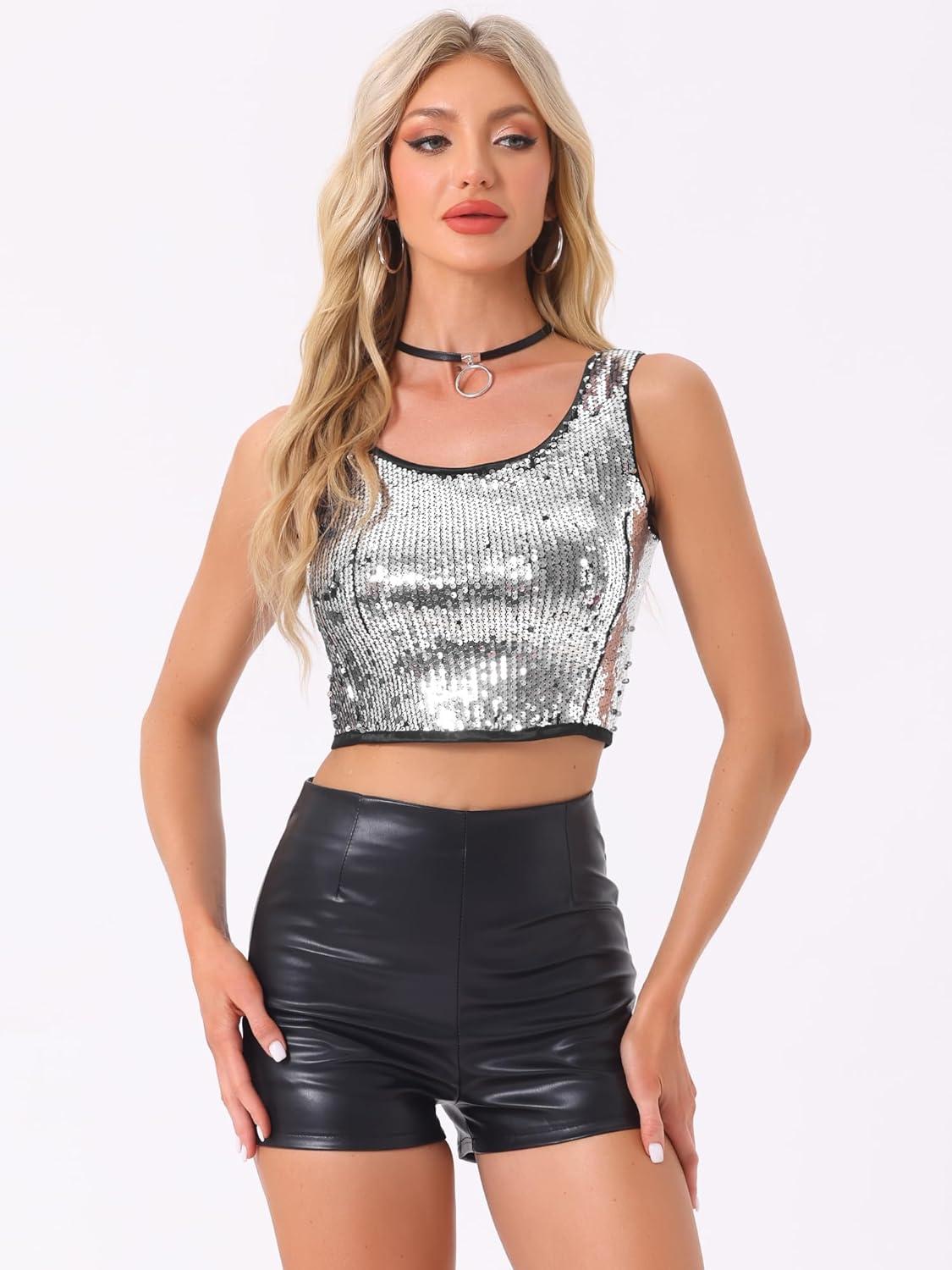 imageAllegra K Womens Sequin Tops Metallic Sparkle Glitter Sleeveless Camisole Tank Top Party Club Crop TopsBlack Silver