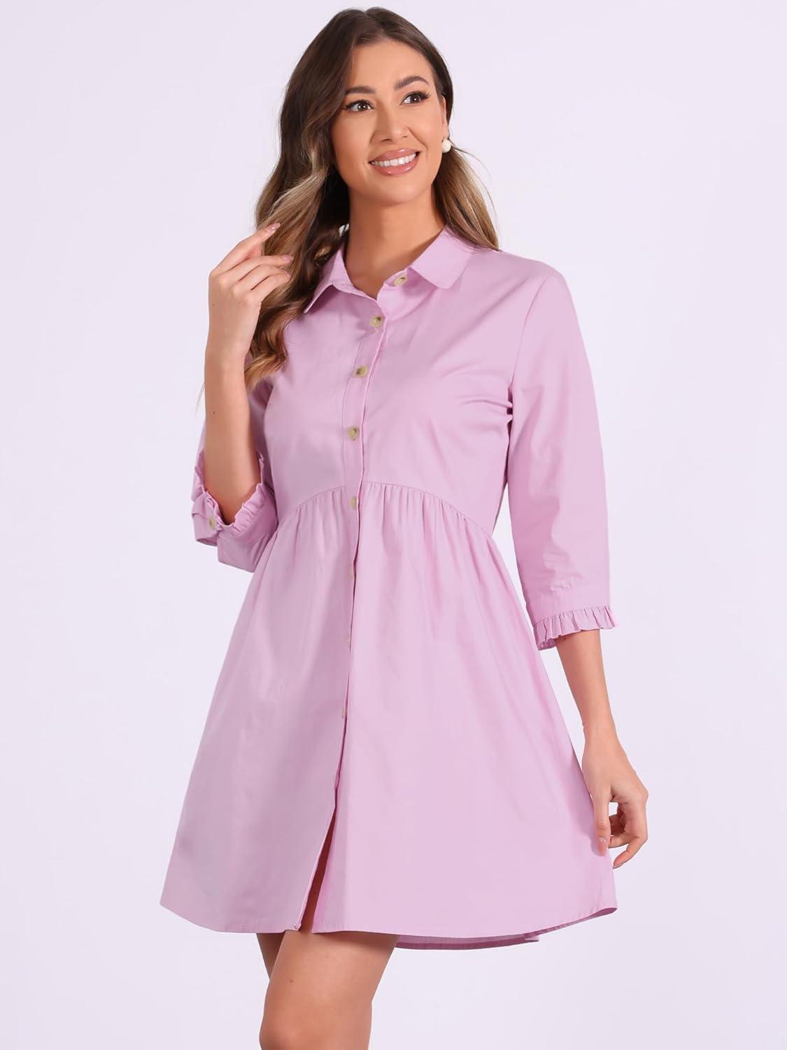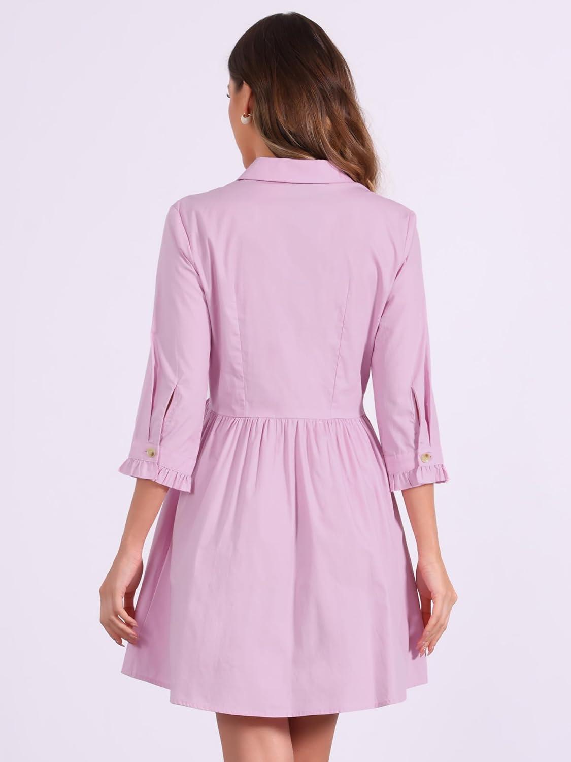 Allegra K Women’s Shirt Dress Button Down 3/4 Sleeve School Work Mini Casual Shirtdresses(Pink Purple)