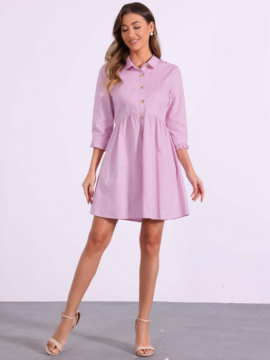 Allegra K Women's Shirt Dress Button Down 3/4 Sleeve School Work Mini Casual Shirtdresses(Pink Purple)