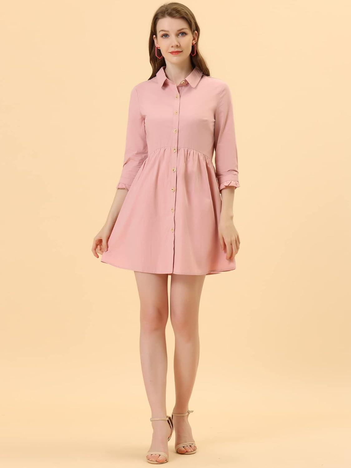 Allegra K Women’s Shirt Dress Button Down 3/4 Sleeve School Work Mini Casual Shirtdresses(Pink)