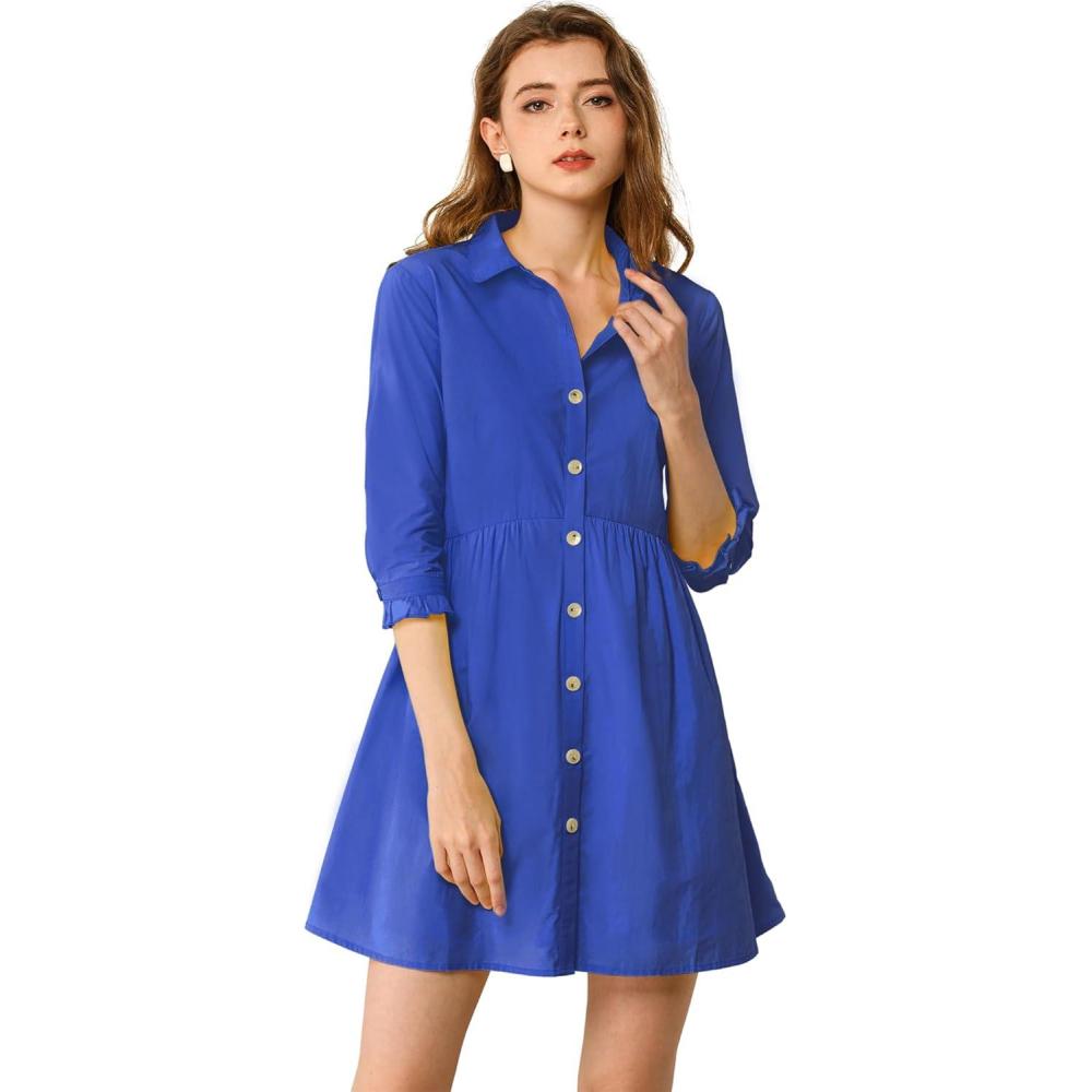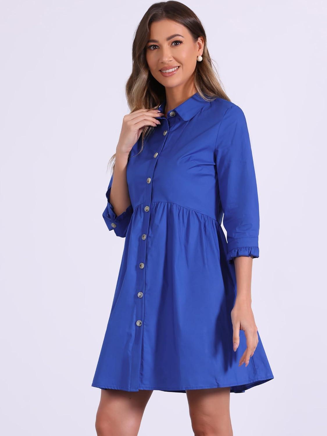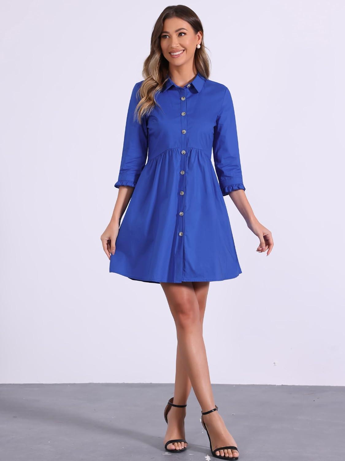 Allegra K Women’s Shirt Dress Button Down 3/4 Sleeve School Work Mini Casual Shirtdresses(Royal Blue)