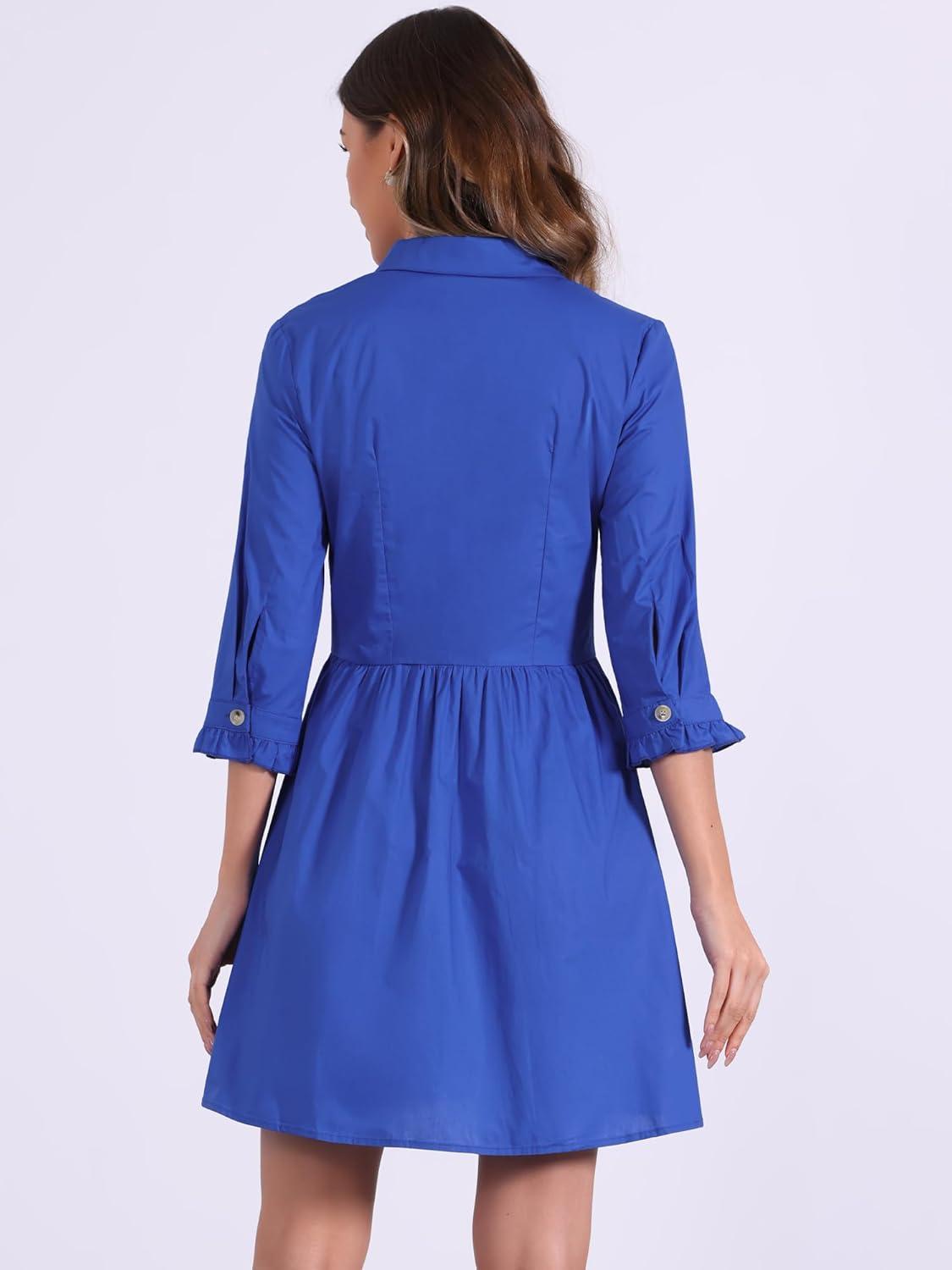 Allegra K Women's Shirt Dress Button Down 3/4 Sleeve School Work Mini Casual Shirtdresses(Royal Blue)