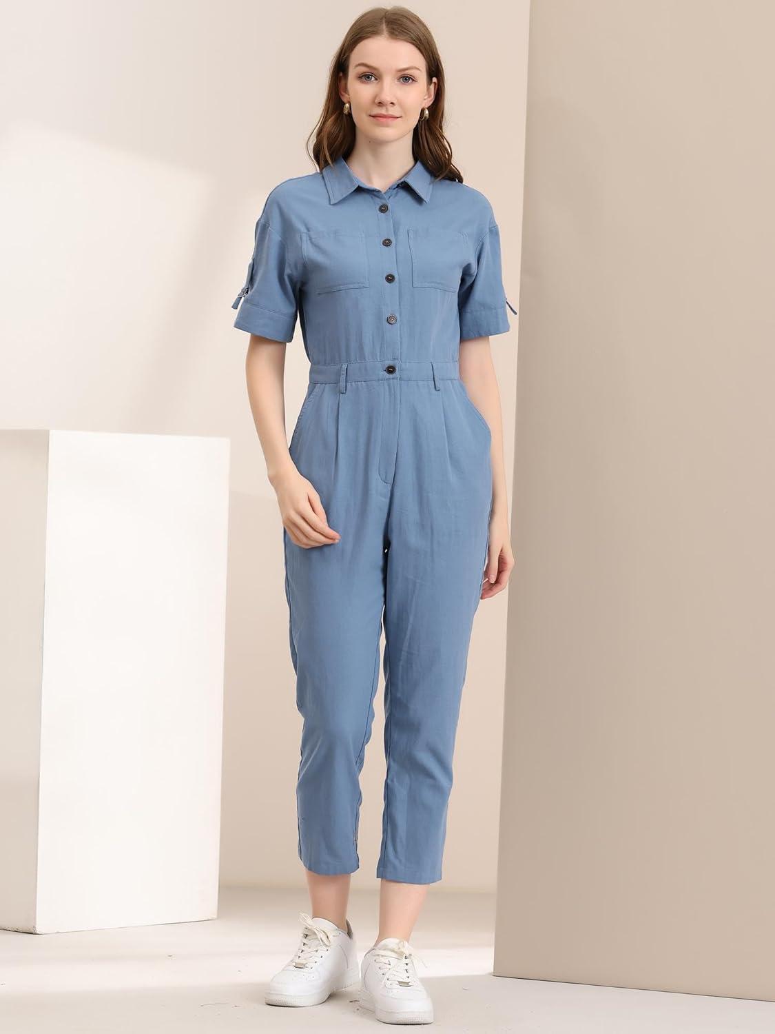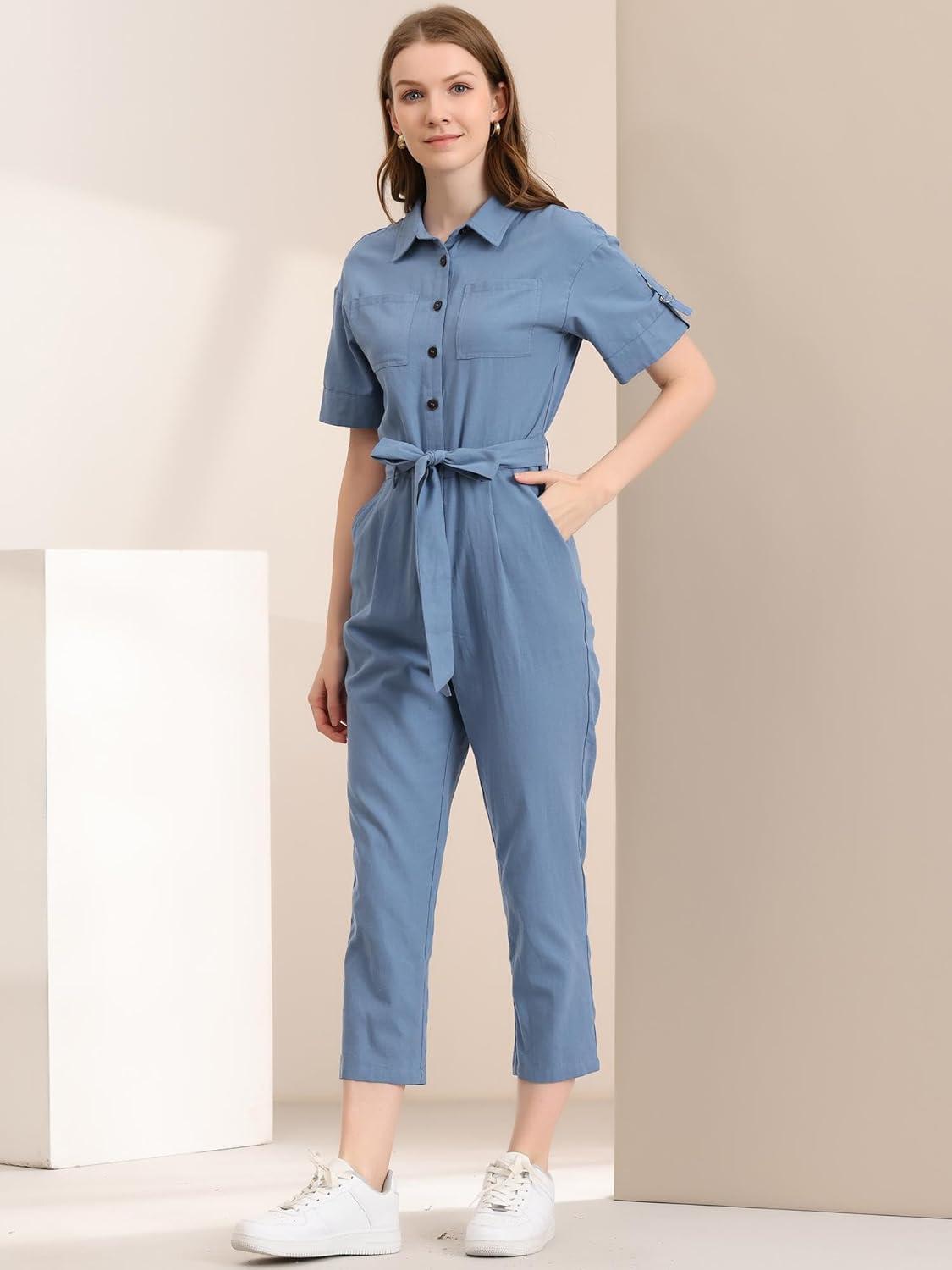 Allegra K Women’s Short Sleeve Collared Cropped Coverall Button Down Tie Waist Cotton Cargo Jumpsuit(Blue)