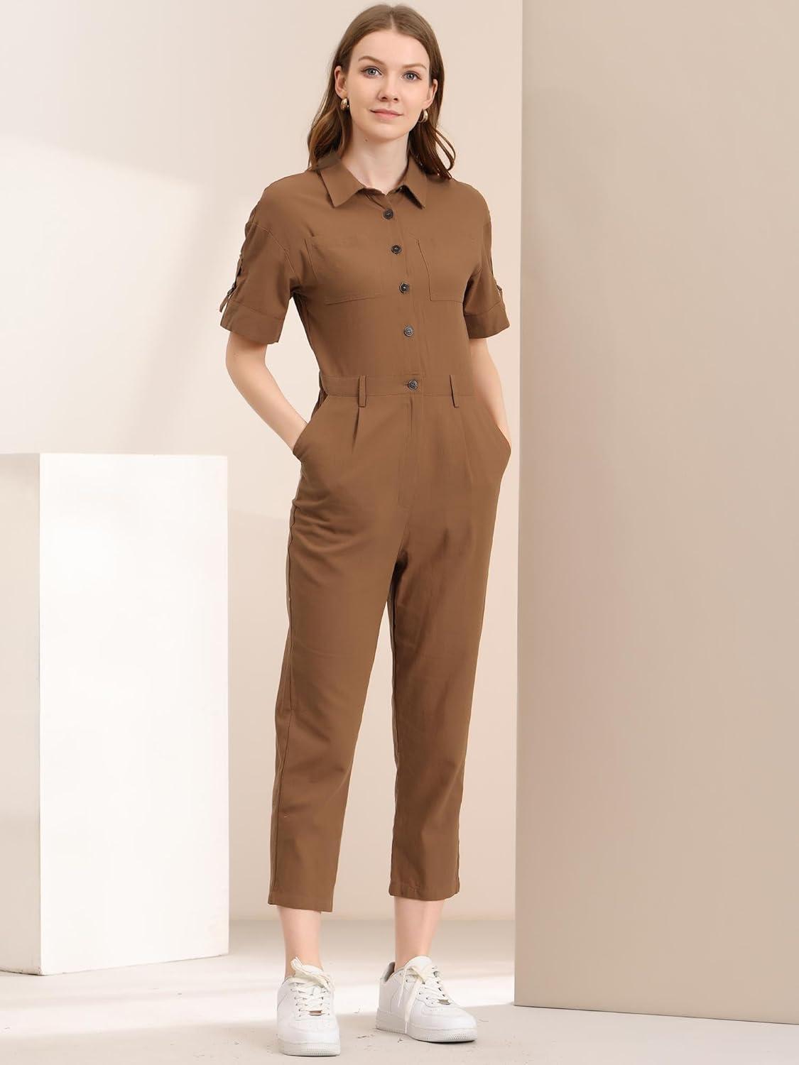 Allegra K Women's Short Sleeve Collared Cropped Coverall Button Down Tie Waist Cotton Cargo Jumpsuit(Brown)