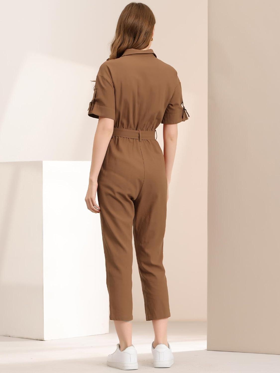 imageAllegra K Womens Short Sleeve Collared Cropped Coverall Button Down Tie Waist Cotton Cargo JumpsuitCoffee