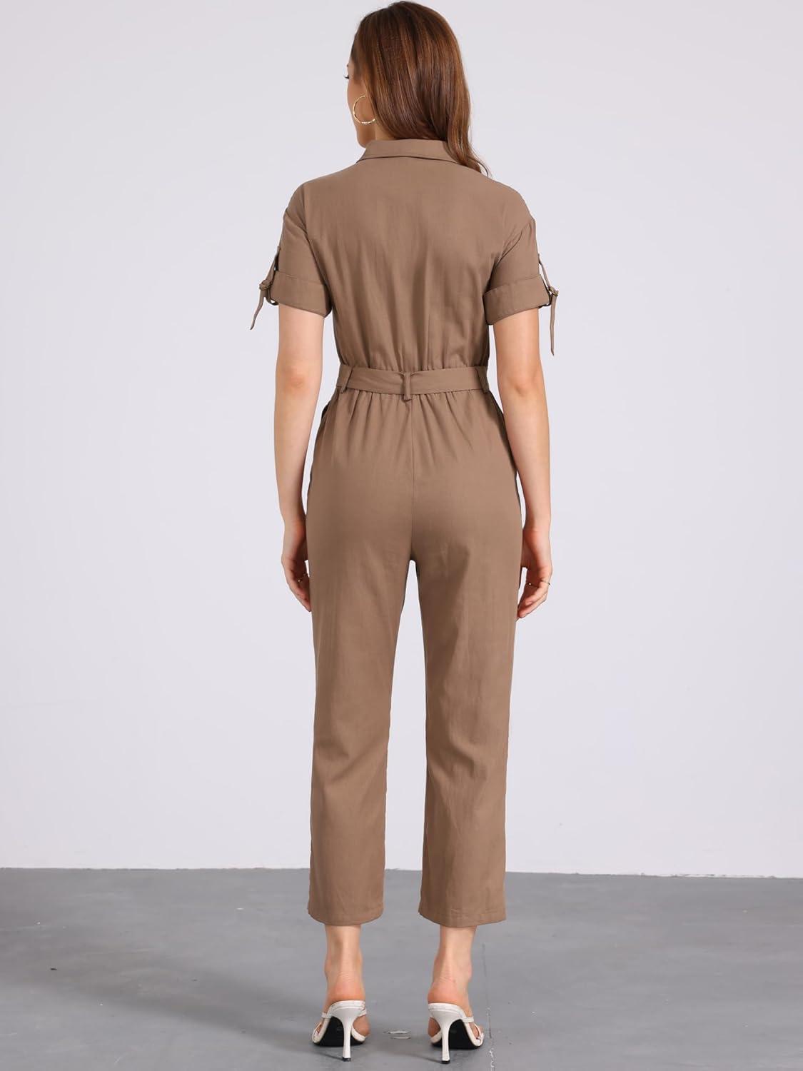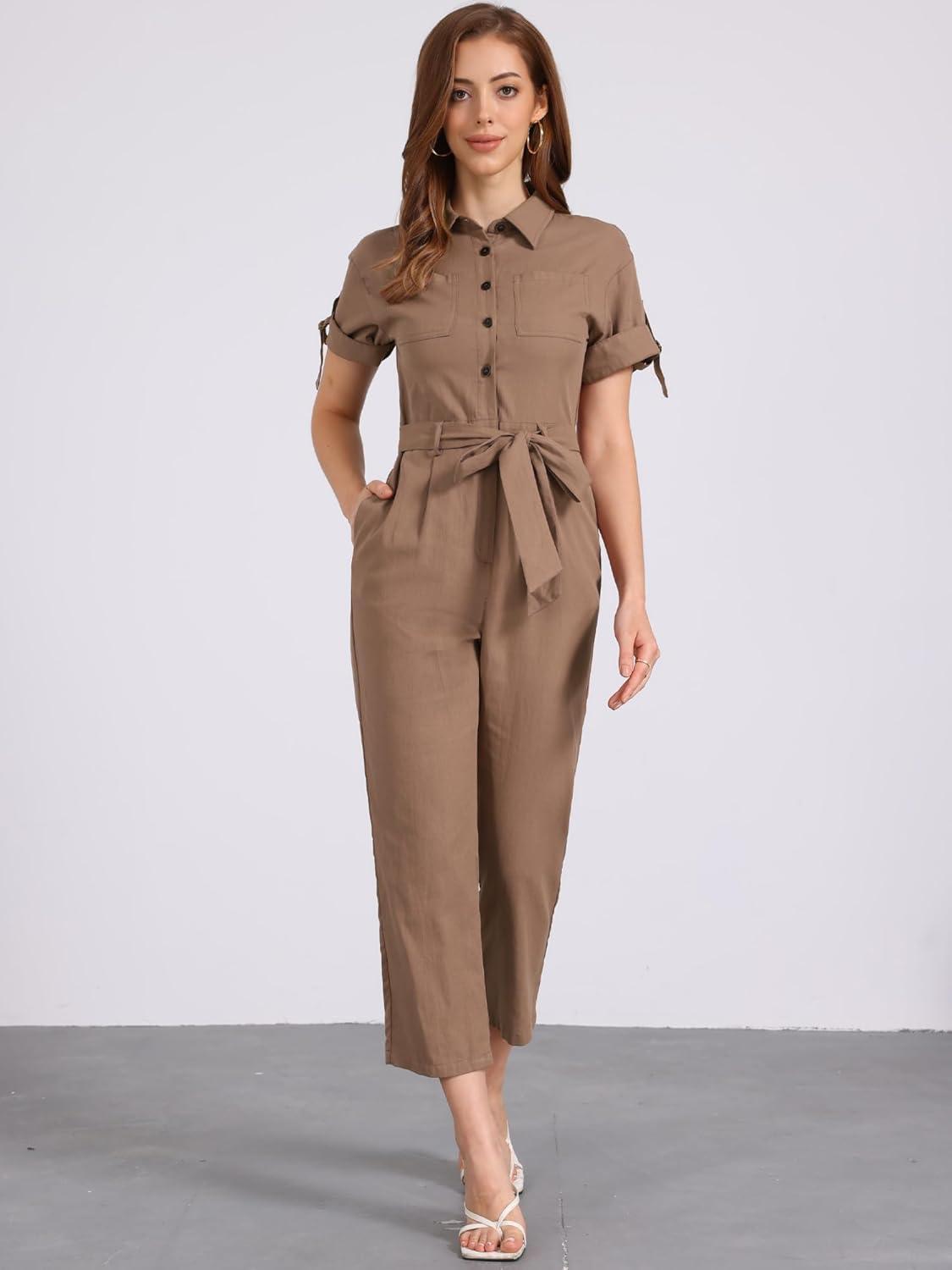 Allegra K Women's Short Sleeve Collared Cropped Coverall Button Down Tie Waist Cotton Cargo Jumpsuit(Coffee)