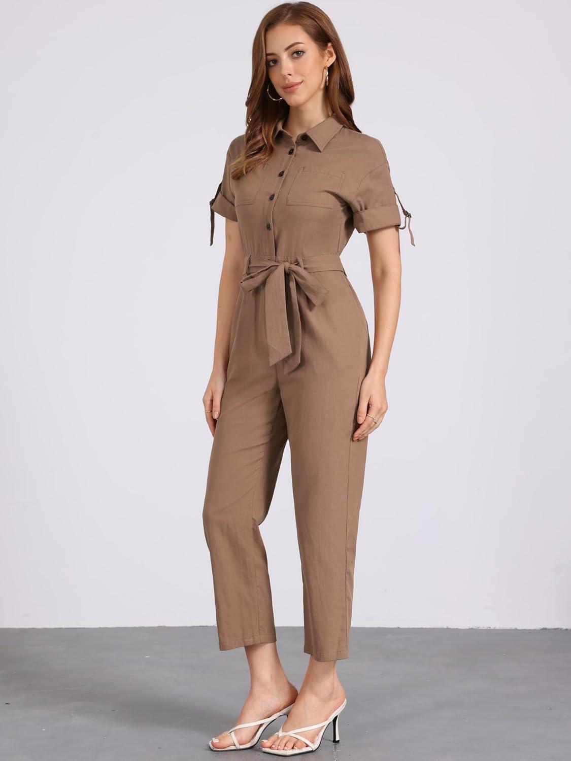 Allegra K Women’s Short Sleeve Collared Cropped Coverall Button Down Tie Waist Cotton Cargo Jumpsuit(Coffee)