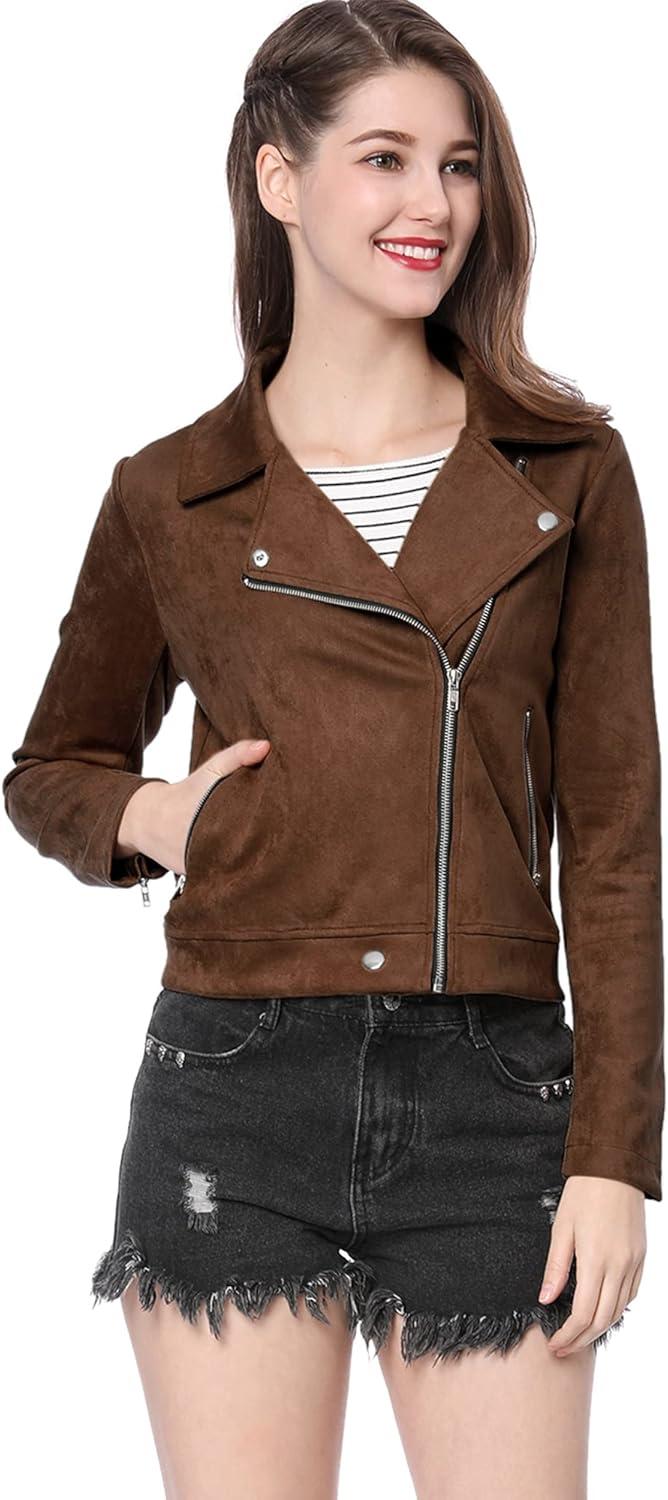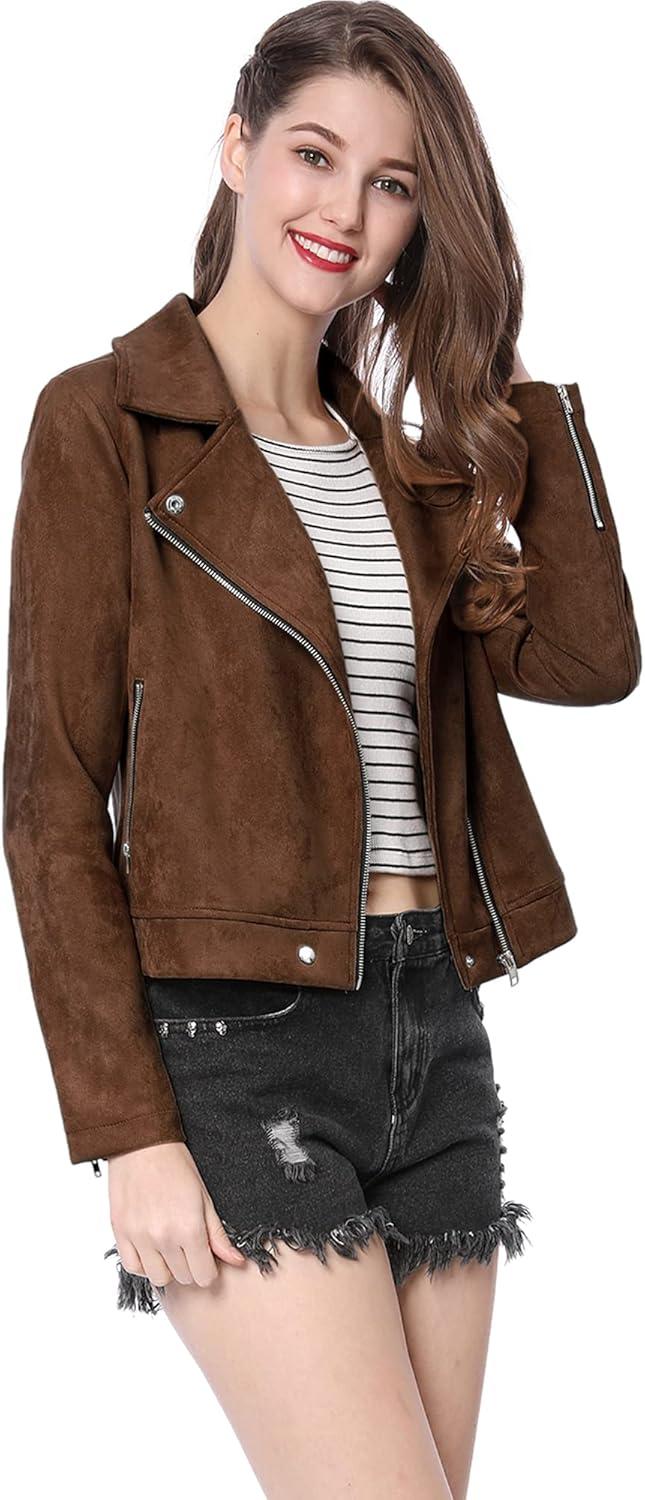 Allegra K Women’s Short Soft Zip Up Faux Suede Biker Moto Jacket(Dark Brown)