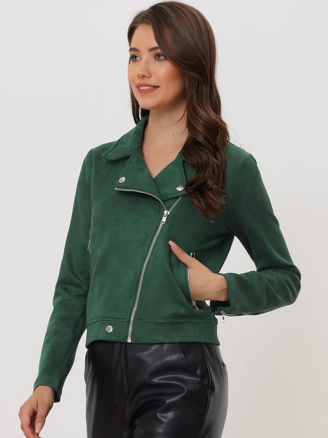 Allegra K Women’s Short Soft Zip Up Faux Suede Biker Moto Jacket(Dark Green)