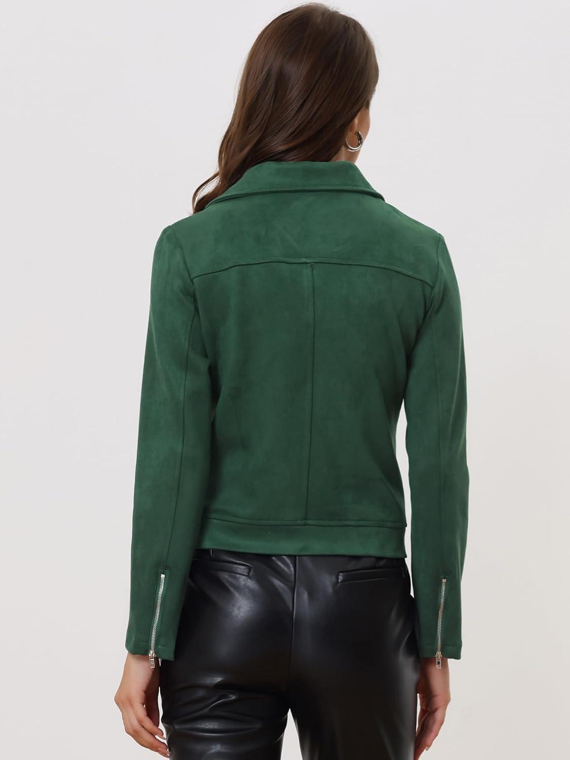 Allegra K Women's Short Soft Zip Up Faux Suede Biker Moto Jacket(Dark Green)