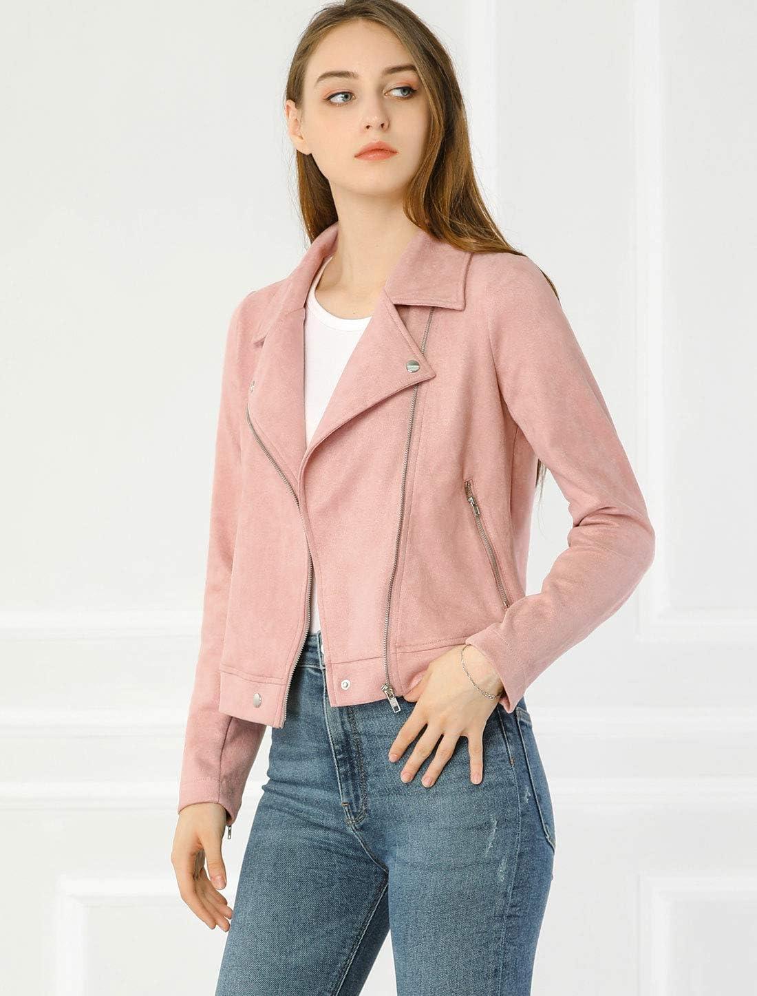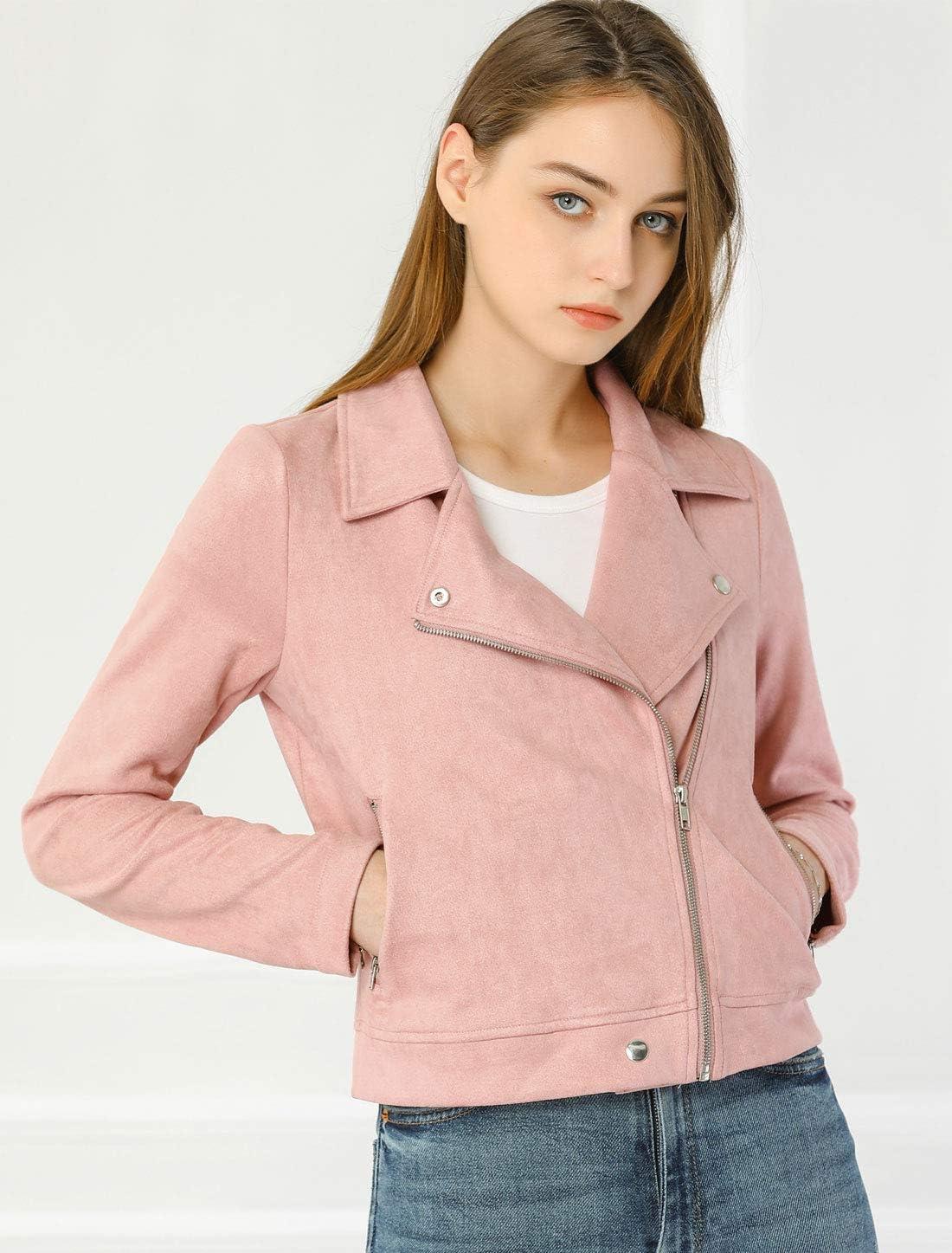 Allegra K Women’s Short Soft Zip Up Faux Suede Biker Moto Jacket(Pink)