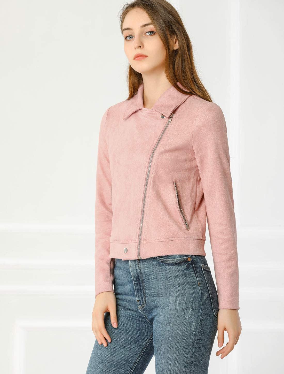 Allegra K Women's Short Soft Zip Up Faux Suede Biker Moto Jacket(Pink)