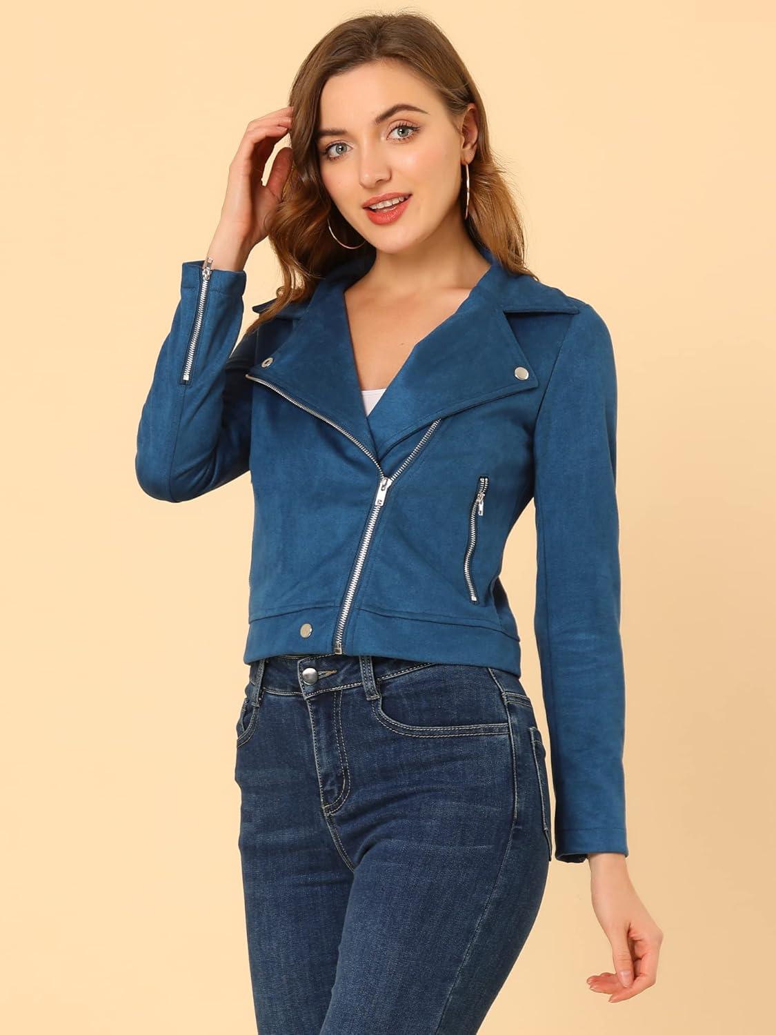 Allegra K Women's Short Soft Zip Up Faux Suede Biker Moto Jacket(Royal Blue)