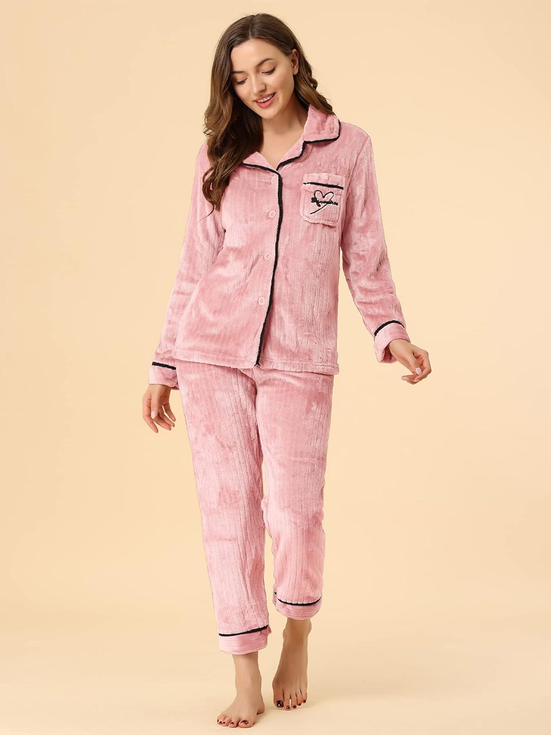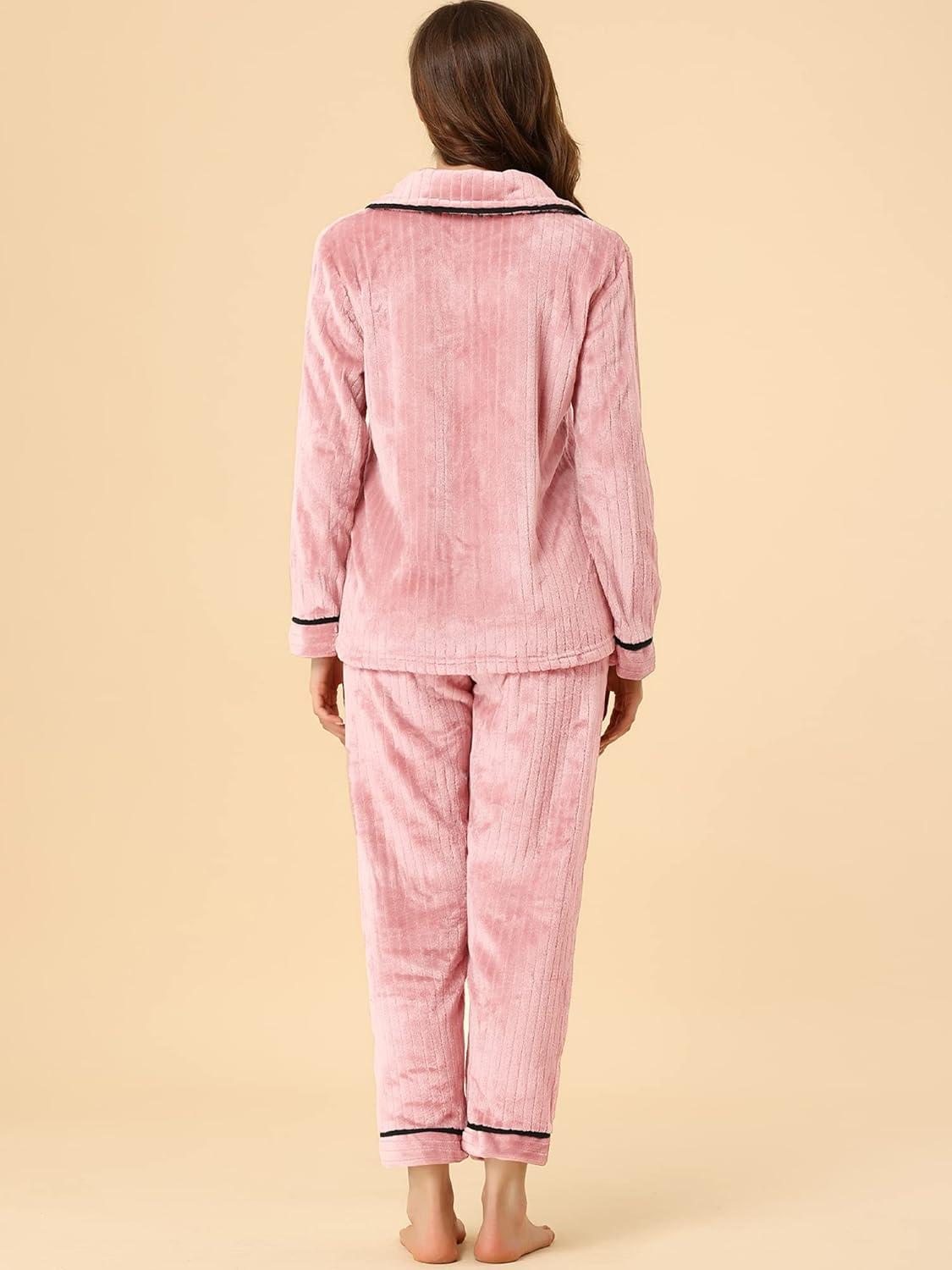 Allegra K Women's Sleepwear Flannel Button Down Lounge Winter Long Sleeves Pajama Sets(Pink)
