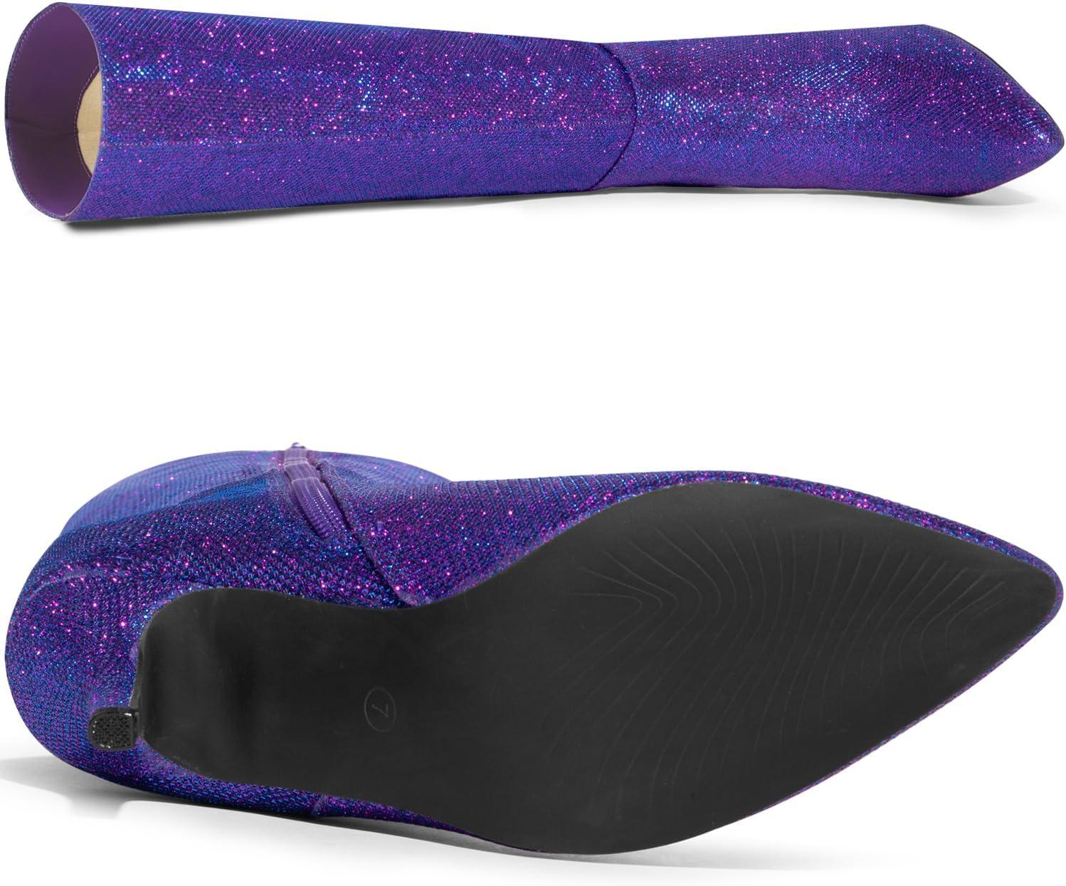 Allegra K Women’s Sparkle Glitter Pointy Toe Stiletto Heel Knee High Boots(Purple)