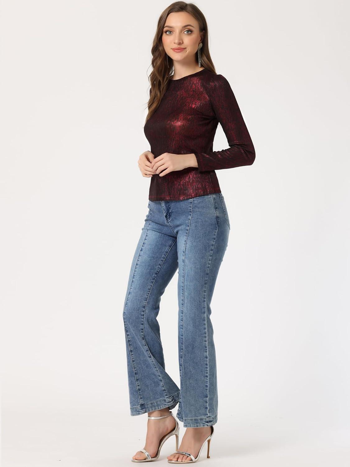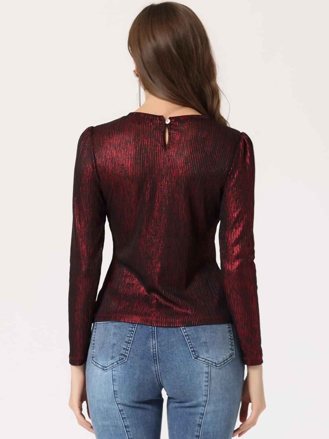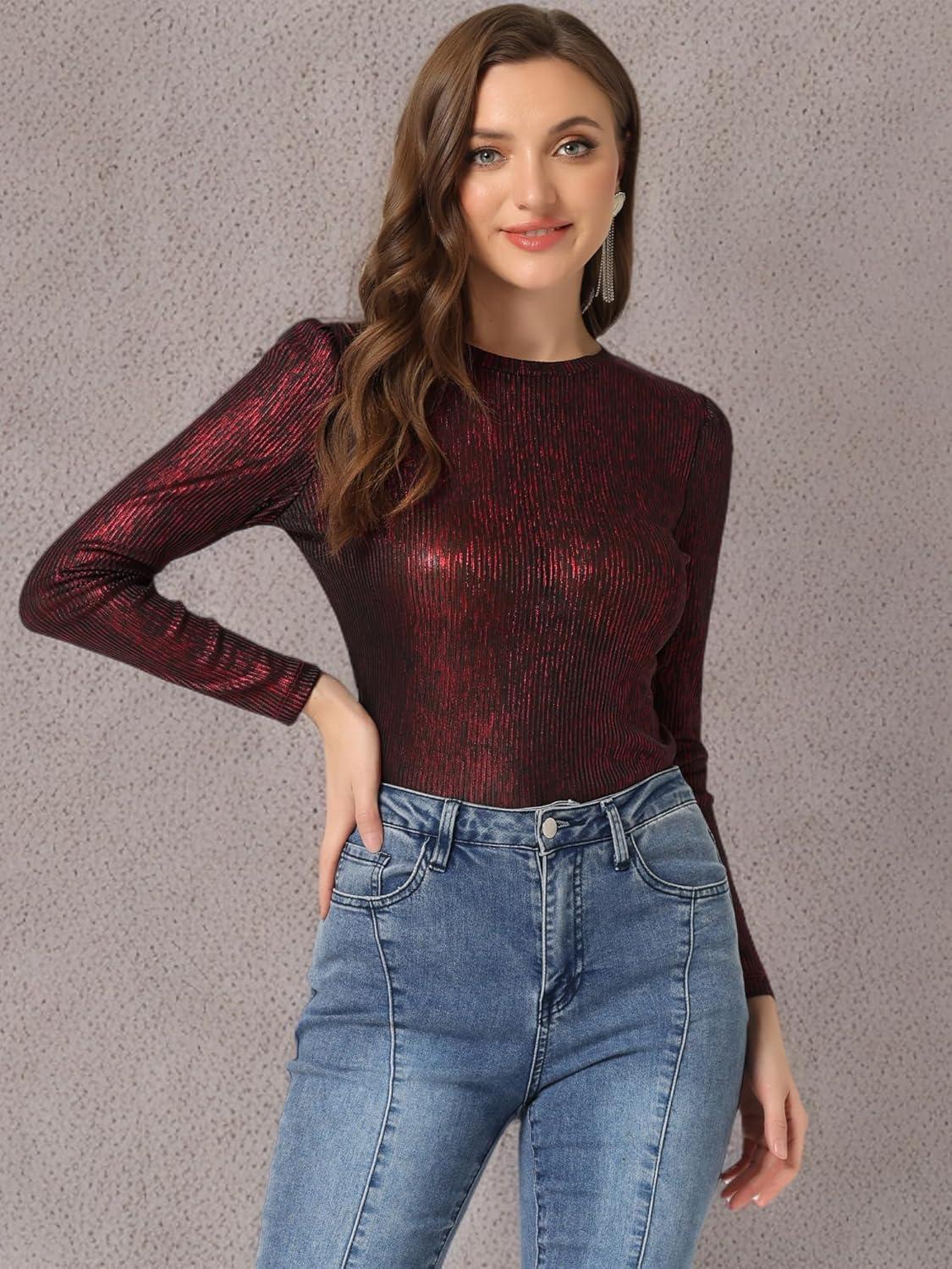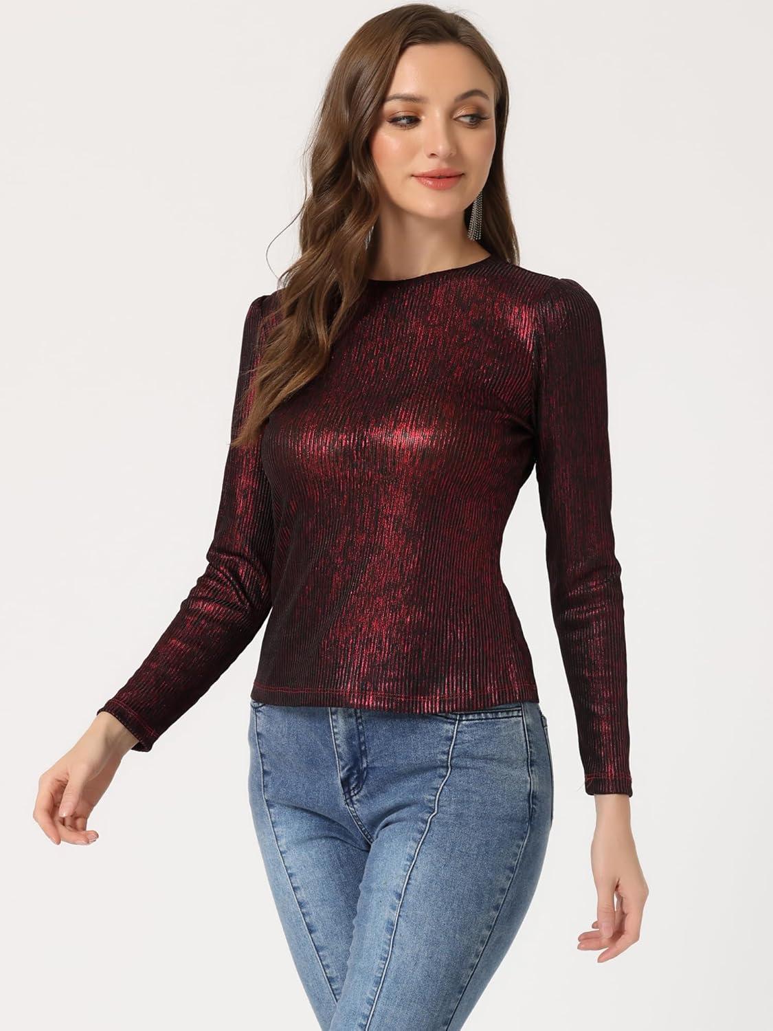 Allegra K Women’s Sparkly Glitter Tops Shiny Metallic 80s Disco Outfits(Black Red)