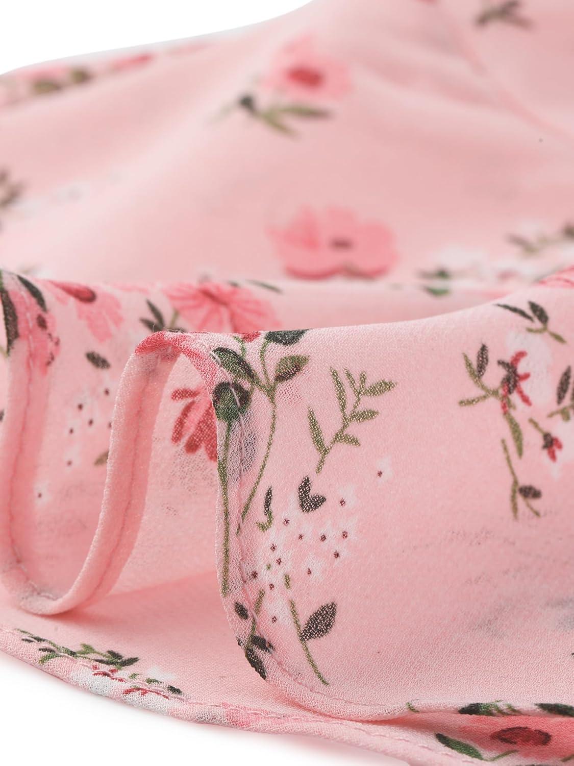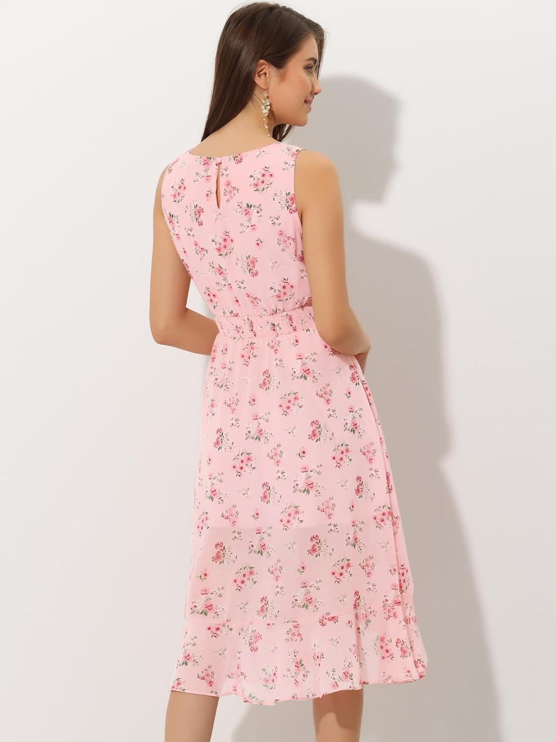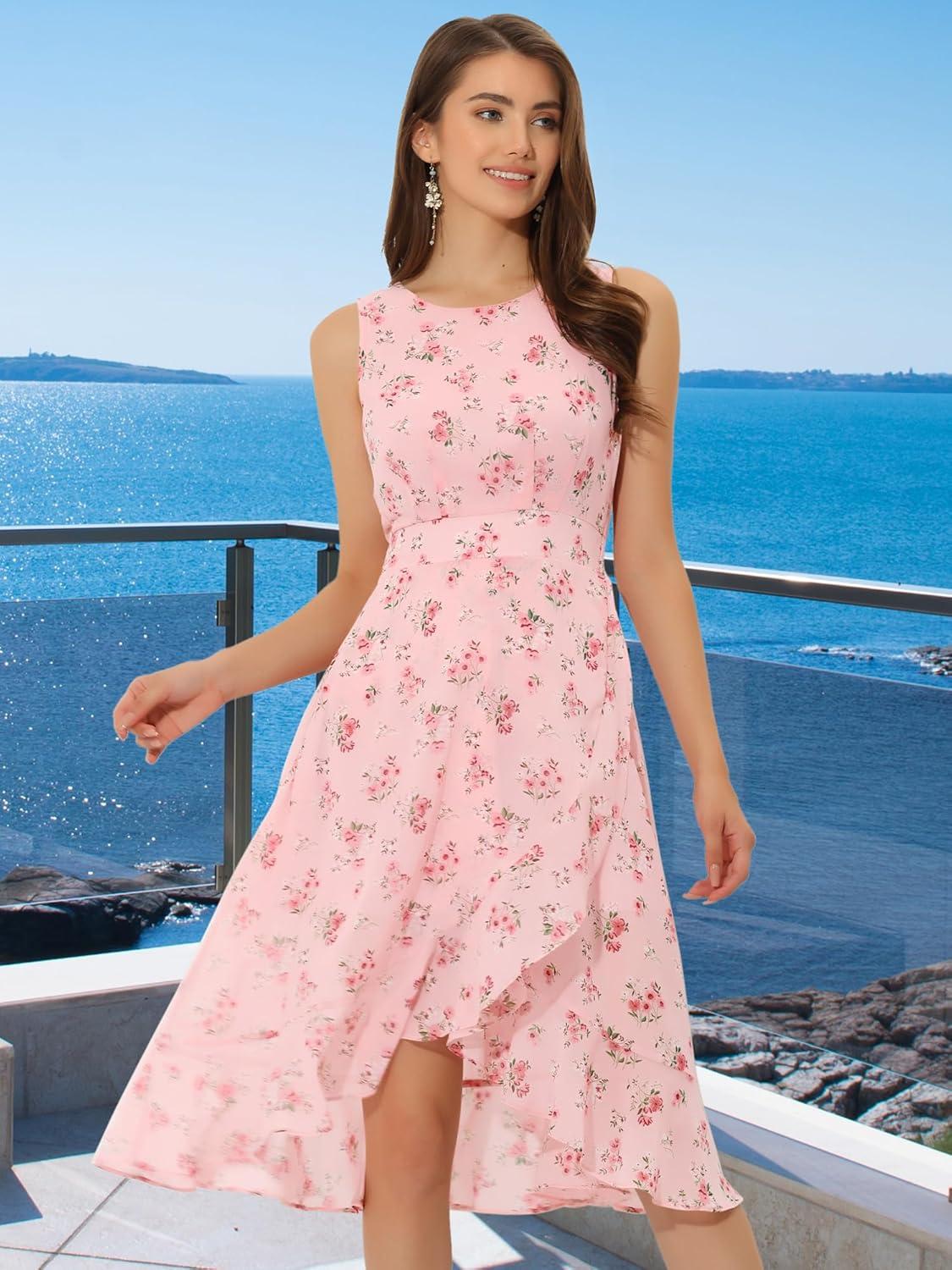 Allegra K Women's Summer Dresses 2025 Wrap Ruffle High Low Hem Round Neck Keyhole Back Sleeveless Floral Dress(Pink)