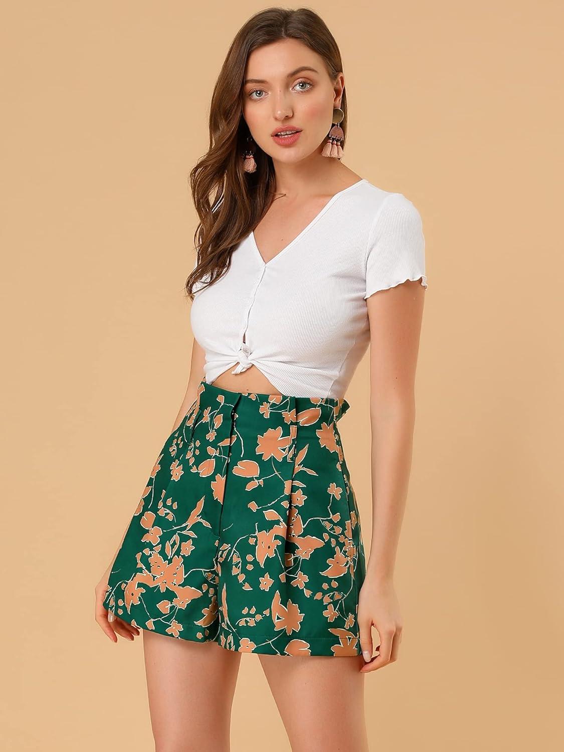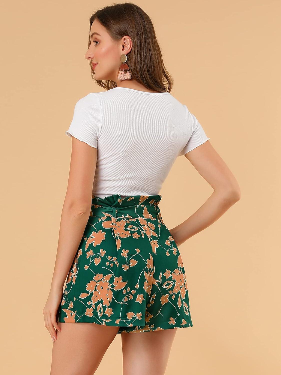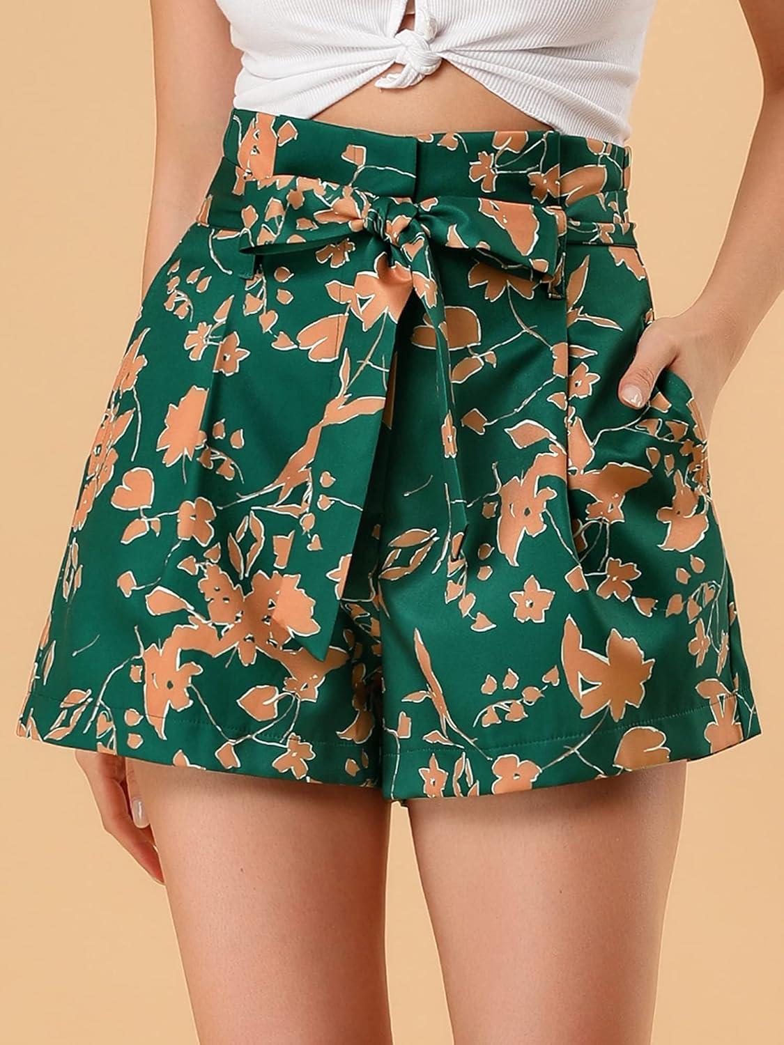 Allegra K Women's Summer Shorts with Pockets Casual 2025 Trendy Bowknot Tie High Waist Paperbag Shorts(Green-floral)