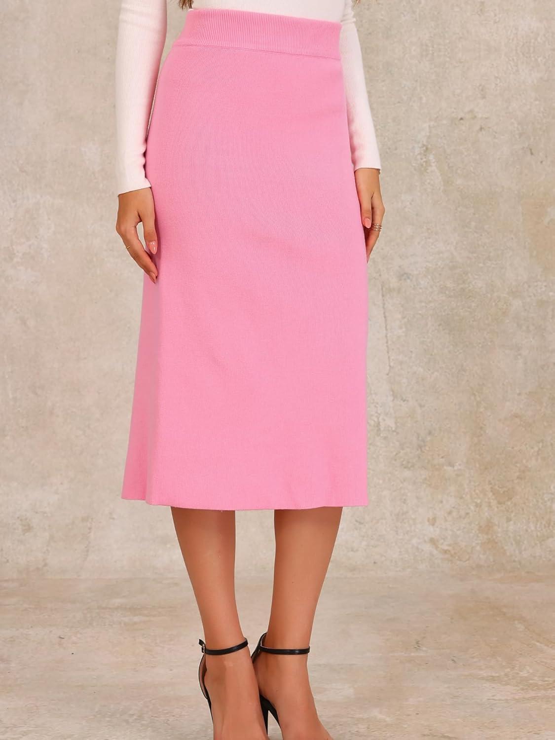 Allegra K Women's Sweater Skirts Ribbed Knit Elastic High Waist Stretchy Slit Casual Office Pencil Midi Skirt(Pink)