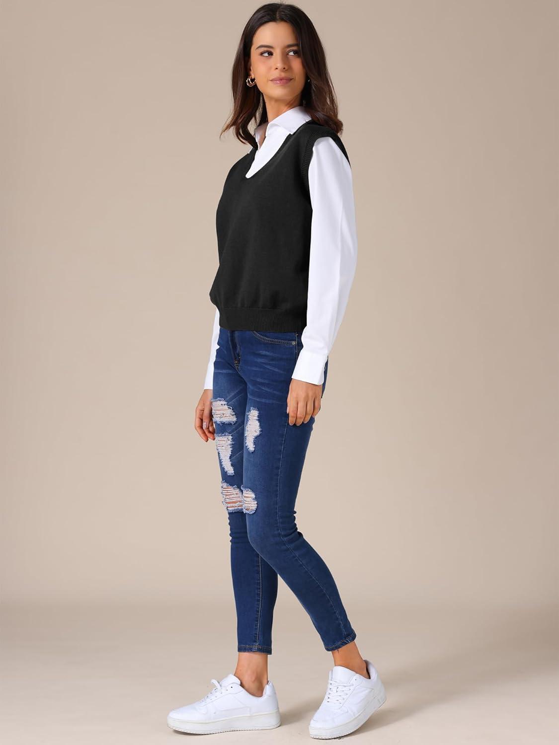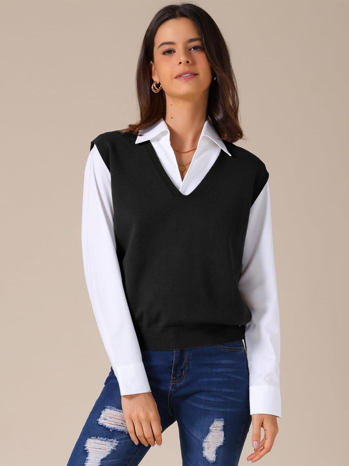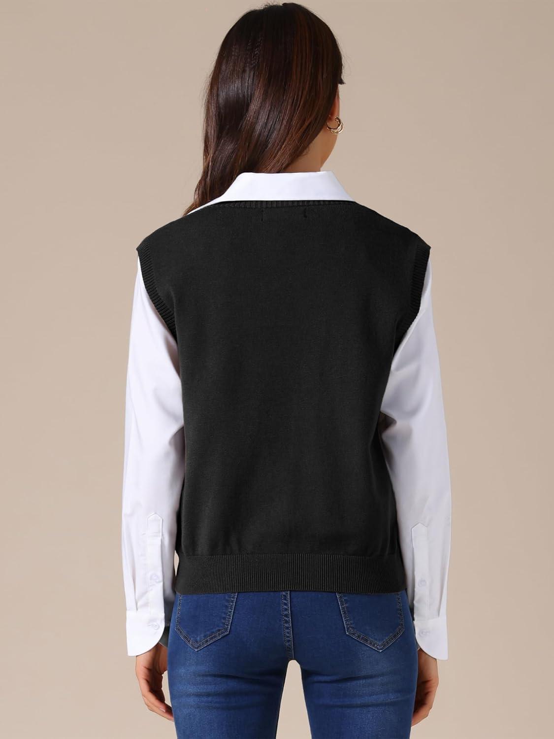 Allegra K Women’s Sweater Vest V Neck Sleeveless Uniform Classic Knitted Pullover Tops(Black)