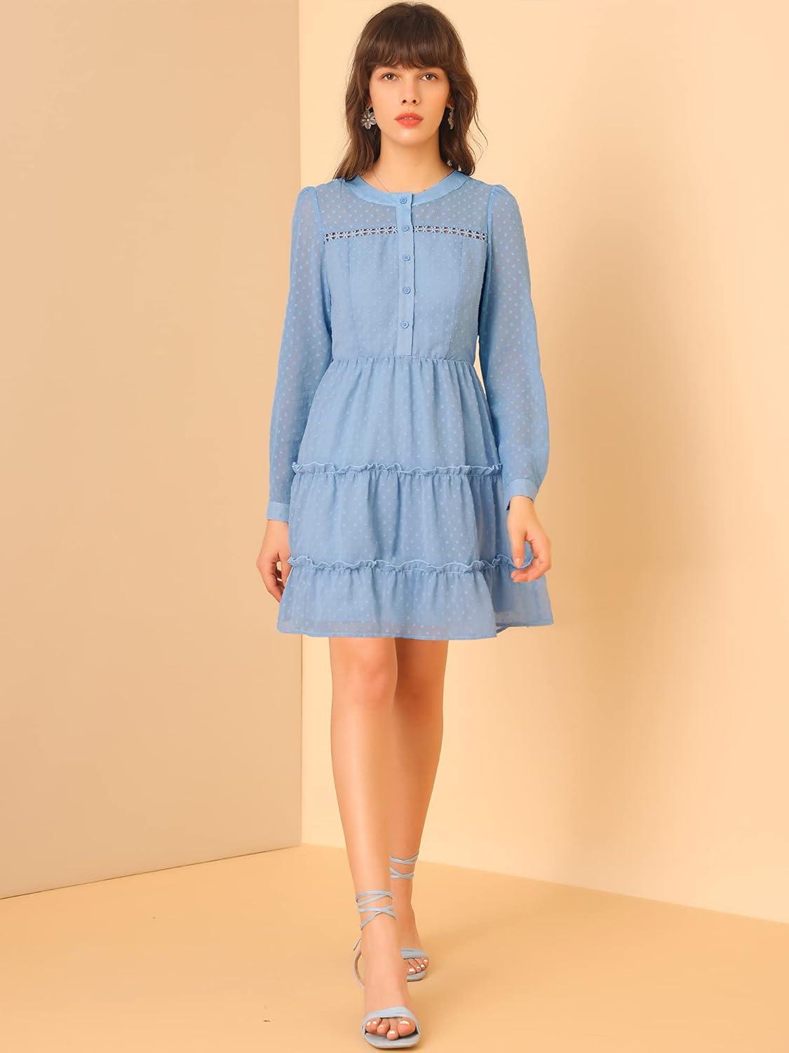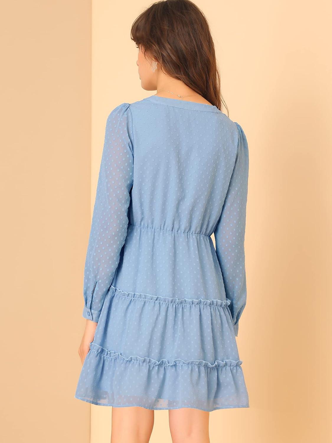 Allegra K Women’s Swiss Dots Elastic Waist A-Line Tiered Flowy Chiffon Dress(Blue)