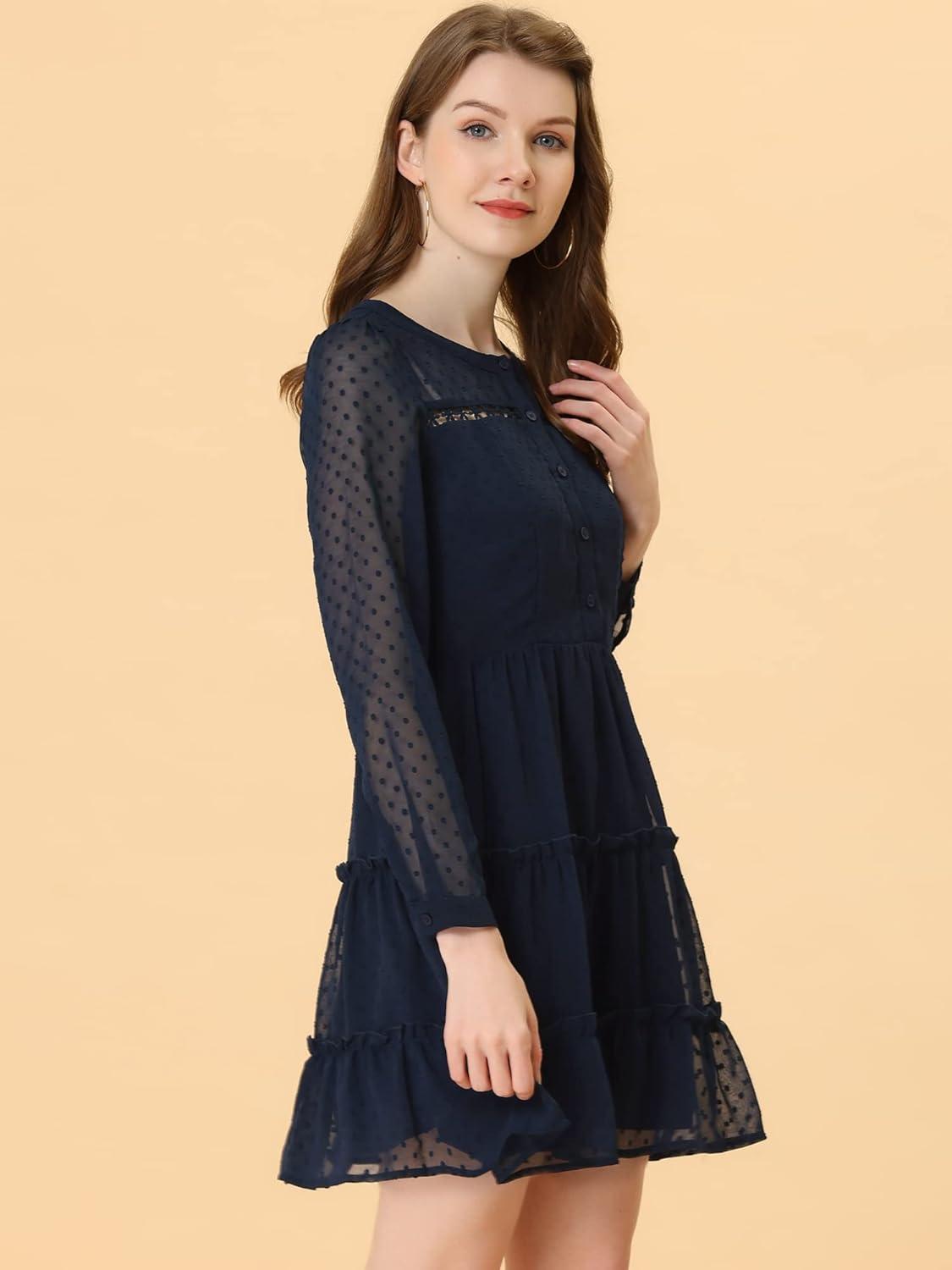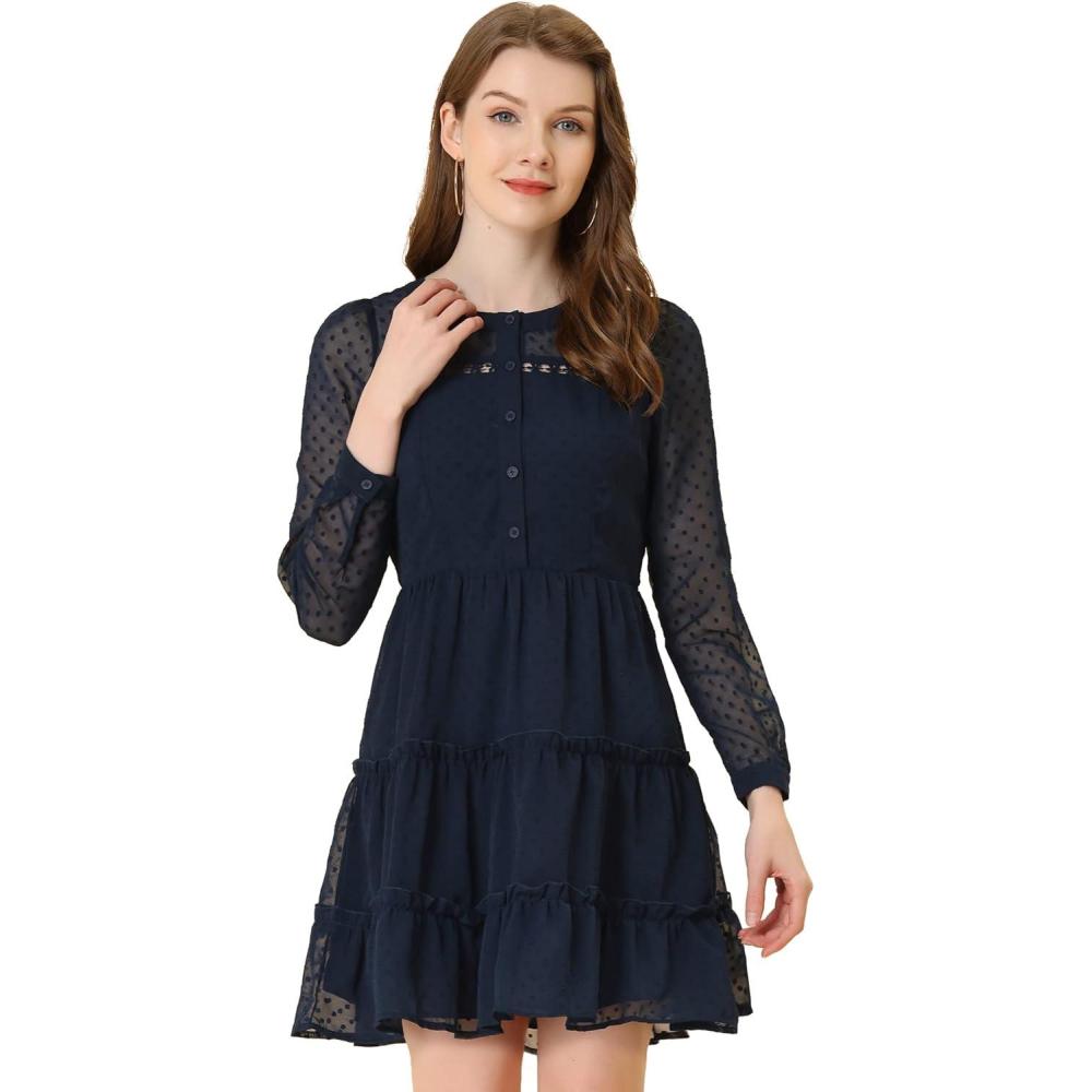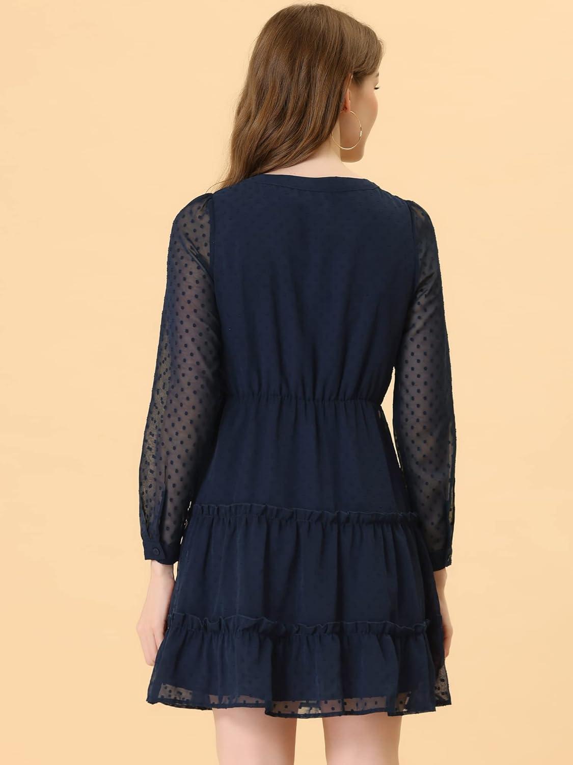 Allegra K Women’s Swiss Dots Elastic Waist A-Line Tiered Flowy Chiffon Dress(Navy Blue)