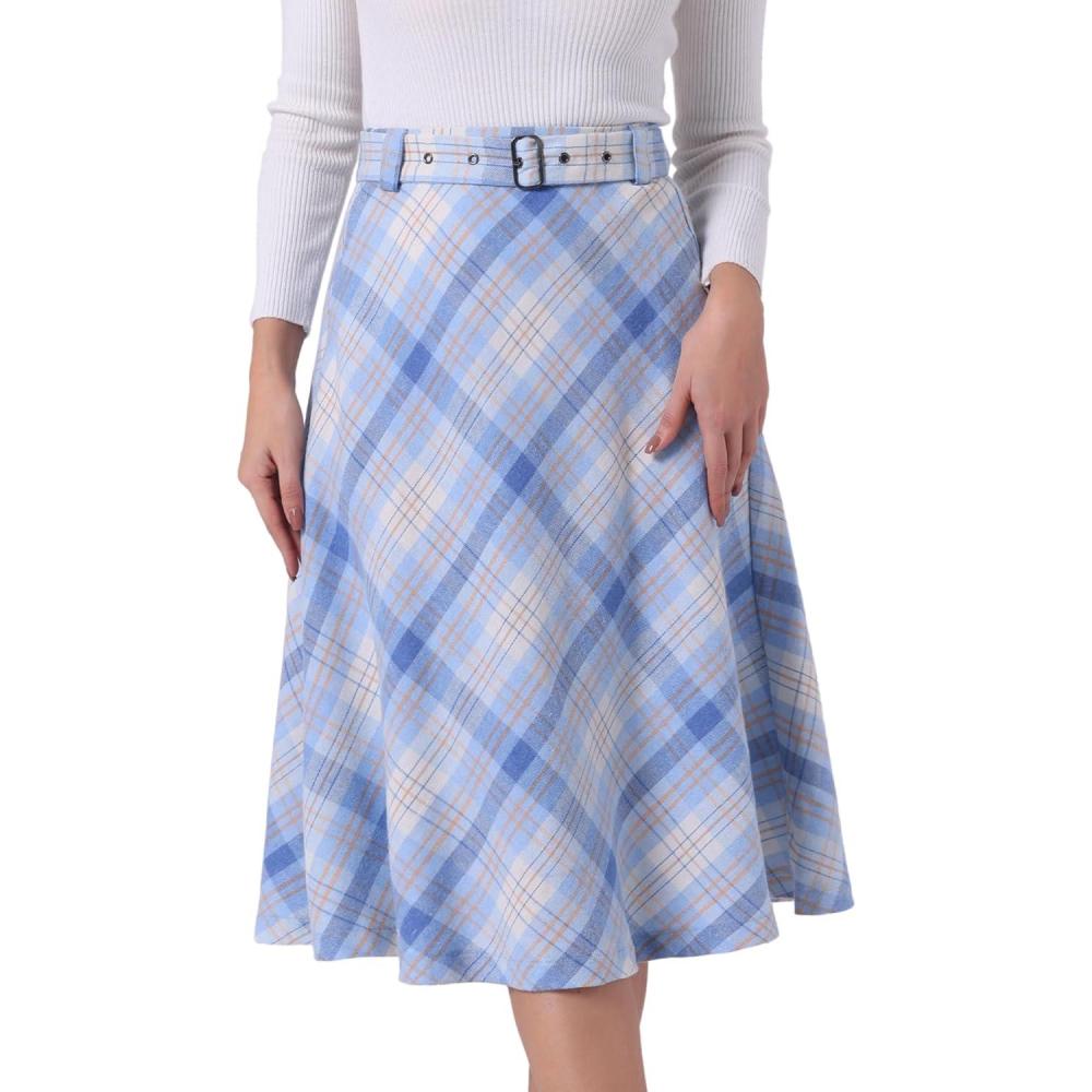 imageAllegra K Womens Tartan Plaid High Waist Belted Vintage ALine Midi SkirtLight Blue